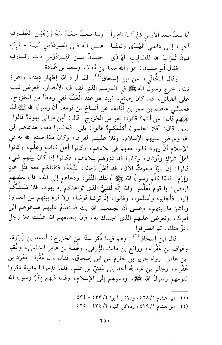 وَقَالَ الْبَكَّائِيُّ، عَنِ ابْنِ إِسْحَاقَ: لَمَّا أَرَادَ اللَّهُ إِظْهَارَ دِينِهِ، وَإِعْزَازَ نَبِيِّهِ، خَرَجَ رَسُولُ اللَّهِ صَلَّى اللَّهُ عَلَيْهِ وَسَلَّمَ فِي الْمَوْسِمِ الَّذِي لَقِيَهُ فِيهِ الْأَنْصَارُ، فَعَرَضَ نَفْسَهُ عَلَى الْقَبَائِلِ، كَمَا كَانَ يَصْنَعُ، فَبَيْنَا هُوَ عِنْدَ الْعَقَبَةِ لَقِيَ رَهْطًا مِنَ الْخَزْرَجِ، فَحَدَّثَنِي عَاصِمُ بْنُ عُمَرَ بْنِ قَتَادَةَ، عَنْ أَشْيَاخٍ مِنْ قَوْمِهِ، أَنَّ رَسُولَ اللَّهِ صَلَّى اللَّهُ عَلَيْهِ وَسَلَّمَ لَمَّا لَقِيَهُمْ قَالَ: مَنْ أَنْتُمْ؟ قَالُوا: نَفَرٌ مِنَ الْخَزْرَجِ، قَالَ: أَمِنْ مَوَالِي يَهُودَ؟ قَالُوا: نَعَمْ، قَالَ: أَفَلَا تَجْلِسُونَ أُكَلِّمُكُمْ؟ قَالُوا: بَلَى، فَجَلَسُوا مَعَهُ، فَدَعَاهُمْ إِلَى اللَّهِ وَعَرَضَ عَلَيْهِمُ الْإِسْلَامَ، وَتَلَا عَلَيْهِمُ الْقُرْآنَ، وَكَانَ مِمَّا صَنَعَ اللَّهُ بِهِ فِي الْإِسْلَامِ أَنَّ يَهُودَ كَانُوا مَعَهُمْ فِي بِلَادِهِمْ، وَكَانُوا أهل كتاب وعلم، وكانوا أَهْلَ شِرْكٍ وَأَوْثَانٍ، وَكَانُوا قَدْ غَزَوْهُمْ بِبِلادِهِمْ، فَكَانُوا إِذَا كَانَ بَيْنَهُمْ شَيْءٌ قَالُوا: إِنَّ نَبِيًّا مَبْعُوثٌ الْآنَ، قَدْ أَظَلَّ زَمَانُهُ، نَتَّبِعُهُ، فَنَقْتُلُكُمْ مَعَهُ قَتْلَ عَادٍ وَإِرَمَ، فَلَمَّا كَلَّمَ رَسُولُ اللَّهِ صَلَّى اللَّهُ عَلَيْهِ وَسَلَّمَ أُولَئِكَ النَّفَرَ، وَدَعَاهُمْ إِلَى اللَّهِ، قَالَ بَعْضُهُمْ لِبَعْضٍ: يَا قَوْمُ تَعَلَّمُوا وَاللَّهِ إِنَّهُ لَلنَّبِيُّ الَّذِي توعّدكم به يهود، فلا يسبقنّكم إِلَيْهِ، فَأَجَابُوهُ وَأَسْلَمُوا وَقَالُوا: إِنَّا تَرَكْنَا قَوْمَنَا، وَلَا قَوْمَ بَيْنَهُمْ مِنَ الْعَدَاوَةِ وَالشَّرِّ مَا بينهم، وعسى أن يجمعهم الله بِكَ فَسَنُقْدِمُ عَلَيْهِمْ فَنَدْعُوهُمْ إِلَى أَمْرِكَ، وَنَعْرِضُ عَلَيْهِمُ الَّذِي أَجَبْنَاكَ بِهِ، فَإِنْ يَجْمَعْهُمُ اللَّهُ عَلَيْكَ فَلَا رَجُلَ أَعَزُّ مِنْكَ، ثُمَّ انْصَرَفُوا.