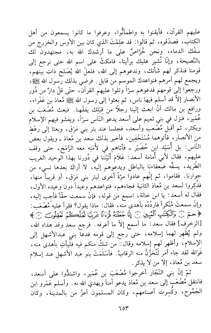 عَلَيْهِمُ الْقُرْآنَ، فَأَيْقَنُوا بِهِ وَاطْمَأَنُّوا وَعَرَفُوا مَا كَانُوا يَسْمَعُونَ مِنْ أَهْلِ الْكِتَابِ، فَصَدَّقُوهُ، ثُمَّ قَالُوا: قَدْ عَلِمْتَ الَّذِي كَانَ بَيْنَ الْأَوْسِ وَالْخَزْرَجِ مِنْ سَفْكِ الدِّمَاءِ، وَنَحْنُ حِرَاصٌ عَلَى مَا أَرْشَدَكَ اللَّهُ بِهِ، مُجْتَهِدُونَ لَكَ بِالنَّصِيحَةِ، وَإِنَّا نُشِيرُ عَلَيْكَ بِرَأْيِنَا، فَامْكُثْ عَلَى اسْمِ اللَّهِ حَتَّى نَرْجِعَ إِلَى قَوْمِنَا فَنَذْكُرَ لَهُمْ شَأْنَكَ، وَنَدْعُوَهُمْ إِلَى اللَّهِ، فَلَعَلَّ اللَّهُ يُصْلِحُ ذَاتَ بَيْنِهِمْ، وَيَجْمَعُ لَهُمْ أَمْرَهُمْ فَنُوَاعِدُكَ الْمَوْسِمَ مِنْ قَابِلٍ، فَرَضِيَ بِذَلِكَ رَسُولُ اللَّهِ صَلَّى اللَّهُ عَلَيْهِ وَسَلَّمَ، وَرَجَعُوا إِلَى قَوْمِهِمْ فَدَعَوْهُمْ سِرًّا وَتَلَوْا عَلَيْهِمُ الْقُرْآنَ، حَتَّى قَلَّ دَارٌ مِنْ دُورِ الْأَنْصَارِ إِلَّا قَدْ أَسْلَمَ فِيهَا نَاسٌ، ثُمَّ بَعَثُوا إِلَى رَسُولِ اللَّهِ صَلَّى اللَّهُ عَلَيْهِ وَسَلَّمَ مُعَاذَ بْنَ عَفْرَاءَ، وَرَافِعَ بْنَ مَالِكٍ أَنِ ابْعَثْ إِلَيْنَا رَجُلًا مِنْ قِبَلِكَ يُفَقِّهْنَا، فَبَعَثَ مُصْعَبَ بْنَ عُمَيْرٍ، فَنَزَلَ في بني تميم على أسعد يَدْعُو النَّاسَ سِرًّا، وَيَفْشُو فِيهِمُ الْإِسْلَامُ وَيَكْثُرُ، ثُمَّ أَقْبَلَ مُصْعَبٌ وَأَسْعَدُ، فَجَلَسَا عِنْدَ بِئْرِ بَنِي مَرْقٍ، وَبَعَثَا إِلَى رَهْطٍ مِنَ الْأَنْصَارِ، فَأَتَوْهُمَا مُسْتَخْفِينَ، فَأُخْبِرَ بِذَلِكَ سَعْدُ بْنُ مُعَاذٍ، ويَقُولُ بَعْضُ النَّاسِ: بَلْ أُسَيْدُ بْنُ حُضَيْرٍ فَأَتَاهُمْ فِي لأْمَتِهِ مَعَهُ الرُّمْحُ، حَتَّى وَقَفَ عَلَيْهِمْ، فَقَالَ لأَبِي أُمَامَةَ أَسْعَدَ: عَلَامَ أَتَيْتَنَا فِي دُورِنَا بِهَذَا الْوَحِيدِ الْغَرِيبِ الطَّرِيدِ، يُسَفِّهُ ضُعَفَاءَنَا بِالْبَاطِلِ وَيَدْعُوهُمْ إِلَيْهِ، لَا أَرَاكَ بَعْدَهَا تُسِيءُ مِنْ جِوَارِنَا، فَقَامُوا، ثُمَّ إِنَّهُمْ عَادُوا مَرَّةً أُخْرَى لِبِئْرِ بَنِي مَرْقٍ، أَوْ قَرِيبًا مِنْهَا، فَذَكَرُوا لِسَعْدِ بْنِ مُعَاذٍ الثَّانِيَةَ فَجَاءَهُمْ، فَتَوَاعَدَهُمْ وَعِيدًا دُونَ وَعِيدِهِ الْأَوَّلِ، فَقَالَ لَهُ أَسْعَدُ: يَا ابْنَ خَالَةٍ، اسْمَعْ مِنْ قَوْلِهِ، فَإِنْ سَمِعْتَ حَقًّا فَأَجِبْ إِلَيْهِ، وَإِنْ سَمِعْتَ مُنْكَرًا فَارْدُدْهُ بِأَهْدَى مِنْهُ، فَقَالَ: مَاذَا يَقُولُ؟ فَقَرَأَ عَلَيْهِ مُصْعَبٌ: " حم وَالْكِتَابِ الْمُبِينِ. إِنَّا جعلناه قرآنا عَرَبِيًّا لَعَلَّكُمْ تَعْقِلُونَ " فَقَالَ سَعْدٌ: مَا أَسْمَعُ إِلَّا مَا أَعْرِفُهُ، فَرَجَعَ سَعْدٌ وَقَدْ هَدَاهُ اللَّهُ، وَلَمْ يُظْهِرْ لَهُمَا إِسْلَامَهُ، حَتَّى رَجَعَ إِلَى قَوْمِهِ فَدَعَا بَنِي عَبْدِ الْأَشْهَلِ إِلَى الْإِسْلَامِ، وَأَظْهَرَ لَهُمْ إِسْلَامَهُ وَقَالَ: مَنْ شَكَّ منكم فِيهِ فَلْيَأْتِ بِأَهْدَى مِنْهُ، فَوَاللَّهِ لَقَدْ جَاءَ أَمْرٌ لَتُحَزَّنَّ مِنْهُ الرِّقَابُ، فَأَسْلَمَتْ بَنُو عَبْدِ الْأَشْهَلِ عِنْدَ إِسْلَامِ سَعْدِ بْنِ مُعَاذٍ، إِلَّا مَنْ لَا يُذْكَرُ.