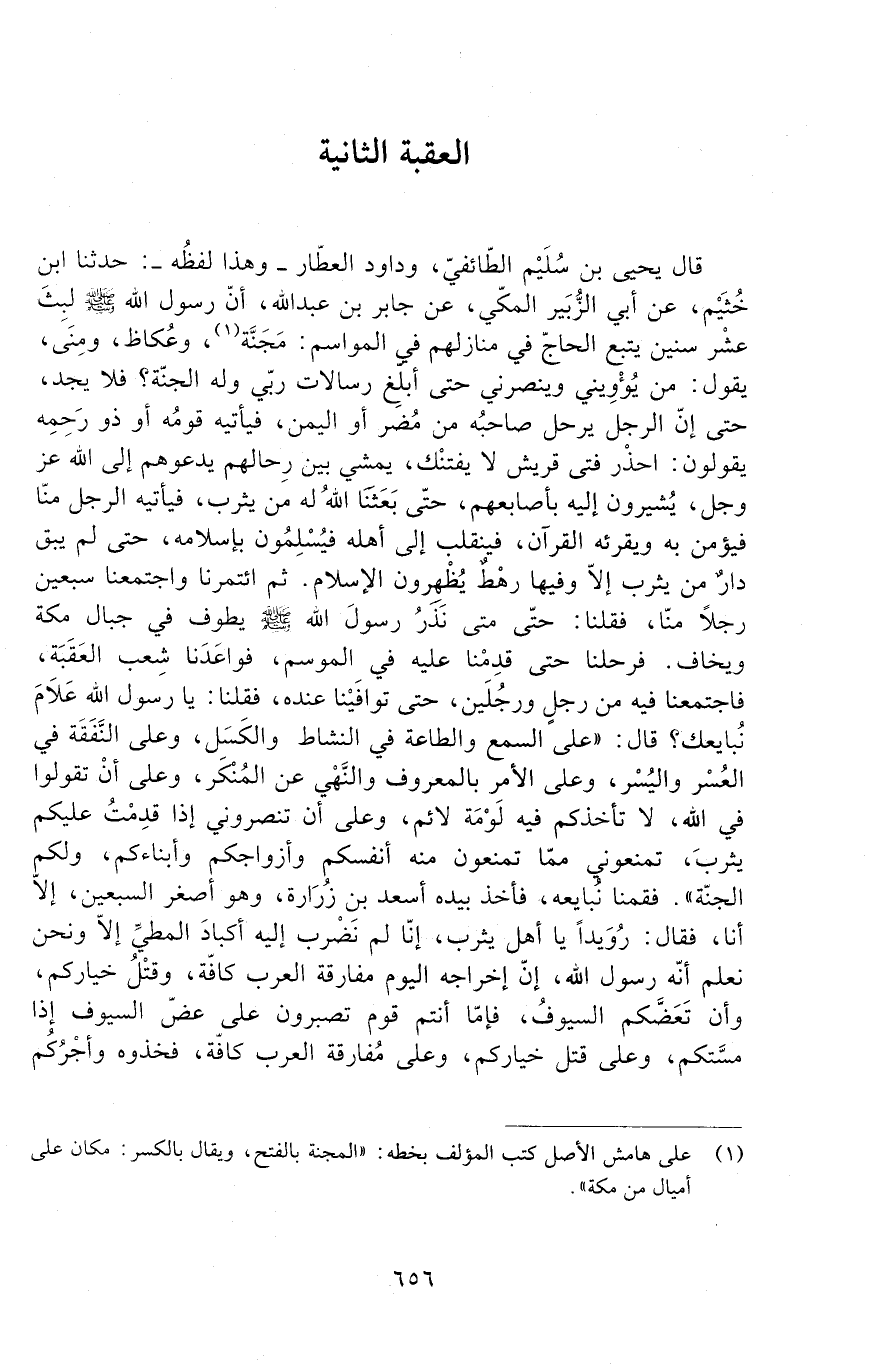 قَالَ يَحْيَى بْنُ سُلَيْمٍ الطَّائِفِيُّ، وداود العطّار وهذا لفظه: حدثنا ابْنُ خُثَيْمٍ، عَنْ أَبِي الزُّبَيْرِ الْمَكِّيِّ، عَنْ جَابِرِ بْنِ عَبْدِ اللَّهِ، أَنَّ رَسُولَ اللَّهِ صَلَّى اللَّهُ عَلَيْهِ وَسَلَّمَ لَبِثَ عَشْرَ سِنِينَ يَتْبَعُ الْحَاجَّ فِي مَنَازِلِهِمْ فِي الْمَوَاسِمِ: مِجَنَّةُ، وَعُكَاظٌ، وَمِنًى، يَقُولُ: مَنْ يُؤْوِينِي وَيَنْصُرُنِي حَتَّى أُبَلِّغَ رِسَالَاتِ رَبِّي وَلَهُ الْجَنَّةُ؟ فَلَا يَجِدُ، حَتَّى إِنَّ الرَّجُلَ يَرْحَلُ صَاحِبُهُ مِنْ مُضَرَ أَوِ الْيَمَنِ، فَيَأْتِيهِ قَوْمُهُ أَوْ ذُو رَحِمِهِ يَقُولُونَ: احْذَرْ فَتَى قُرَيْشٍ لَا يَفْتِنْكَ، يَمْشِي بين رحالهم يدعوهم إلى الله عز وجل، يُشِيرُونَ إِلَيْهِ بِأَصَابِعِهِمْ، حَتَّى بَعَثَنَا اللَّهُ لَهُ مِنْ يَثْرِبَ، فَيَأْتِيهِ الرَّجُلُ مِنَّا فَيُؤْمِنُ بِهِ وَيُقْرِئُهُ الْقُرْآنَ، فَيَنْقَلِبُ إِلَى أَهْلِهِ فَيُسْلِمُونَ بِإِسْلَامِهِ، حَتَّى لَمْ يَبْقَ دَارٌ مِنْ يَثْرِبَ إِلَّا وَفِيهَا رَهْطٌ يُظْهِرُونَ الْإِسْلَامَ، ثُمَّ ائْتَمَرْنَا وَاجْتَمَعْنَا سبعين رَجُلًا مِنَّا، فَقُلْنَا: حَتَّى مَتَى نَذَرُ رَسُولَ اللَّهِ صَلَّى اللَّهُ عَلَيْهِ وَسَلَّمَ يَطُوفُ فِي جِبَالِ مَكَّةَ وَيَخَافُ، فَرَحَلْنَا حَتَّى قَدِمْنَا عَلَيْهِ فِي الْمَوْسِمِ، فَوَاعَدَنَا شِعْبَ الْعَقَبَةِ، فَاجْتَمَعْنَا فِيهِ مِنْ رَجُلٍ وَرَجُلَيْنِ، حَتَّى تَوَافَيْنَا عِنْدَهُ، فَقُلْنَا يَا رَسُولَ اللَّهِ: عَلَامَ نُبَايِعُكَ؟ قَالَ: " عَلَى السَّمْعِ وَالطَّاعَةِ فِي النَّشَاطِ وَالْكَسَلِ، وَعَلَى النَّفَقَةِ فِي الْعُسْرِ وَالْيُسْرِ، وَعَلَى الْأَمْرِ بِالْمَعْرُوفِ وَالنَّهْيِ عَنِ الْمُنْكَرِ، وَعَلَى أَنْ تَقُولُوا فِي اللَّهِ، لَا تَأْخُذْكُمْ فِيهِ لَوْمَةُ لَائِمٍ، وَعَلَى أَنْ تَنْصُرُونِي إِذَا قَدِمْتُ عَلَيْكُمْ يَثْرِبَ، تَمْنَعُونِي مِمَّا تَمْنَعُونَ مِنْهُ أَنْفُسَكُمْ وَأَزْوَاجَكُمْ وَأَبْنَاءَكُمْ، وَلَكُمُ الْجَنَّةُ " فقمنا نُبَايِعُهُ، فَأَخَذَ بِيَدِهِ أَسْعَدُ بْنُ زُرَارَةَ، وَهُوَ أَصْغَرُ السَّبْعِينَ، إِلَّا أَنَا، فَقَالَ: رُوَيْدًا يَا أَهْلَ يَثْرِبَ، إِنَّا لَمْ نَضْرِبْ إِلَيْهِ أَكْبَادَ الْمَطِيِّ إِلَّا وَنَحْنُ نَعْلَمُ أَنَّهُ رَسُولُ اللَّهِ، إِنَّ إِخْرَاجَهُ الْيَوْمَ مُفَارَقَةُ الْعَرَبِ كَافَّةً، وَقَتْلُ خِيَارِكُمْ، وَأَنْ تَعَضَّكُمُ السُّيُوفُ، فَإِمَّا أَنْتُمْ قَوْمٌ تَصْبِرُونَ عَلَى عَضِّ السُّيُوفِ إِذَا مَسَّتْكُمْ، وَعَلَى قَتْلِ خِيَارِكُمْ، وَعَلَى مُفَارَقَةِ الْعَرَبِ كَافَّةً، فَخُذُوهُ وأجركم