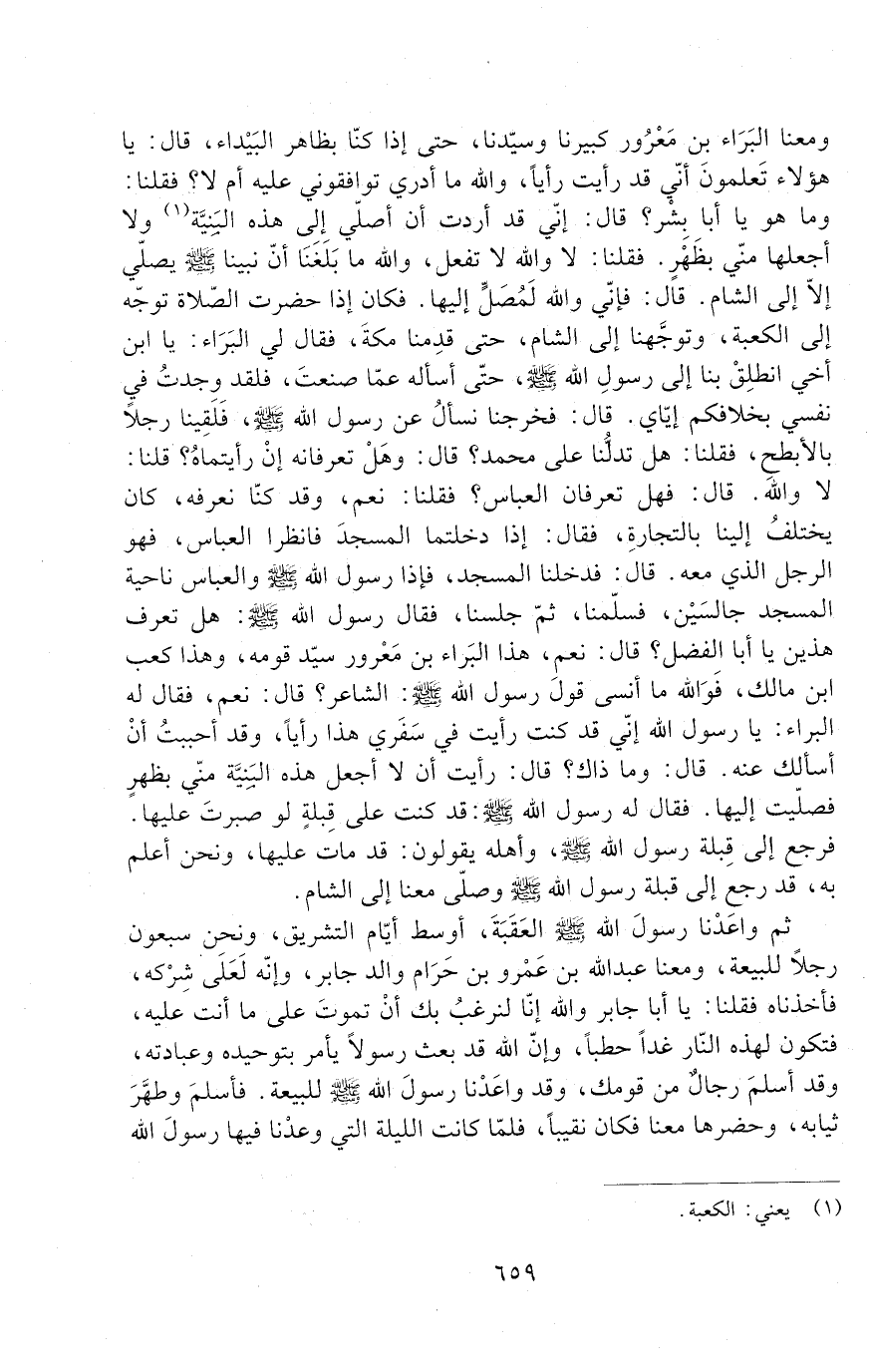 وَمَعَنَا الْبَرَاءُ بْنُ مَعْرُورٍ كَبِيرُنَا وَسَيِّدُنَا، حَتَّى إِذَا كُنَّا بِظَاهِرِ الْبَيْدَاءِ قَالَ: يَا هَؤُلَاءِ تعلّمون إِنِّي قَدْ رَأَيْتُ رَأْيًا، وَاللَّهِ مَا أَدْرِي توافقوني عَلَيْهِ أَمْ لَا، فَقُلْنَا: وَمَا هُوَ يَا أَبَا بِشْرٍ؟ قَالَ: إِنِّي قَدْ أَرَدْتُ أَنْ أُصَلِّيَ إِلَى هَذِهِ الْبَنِيَّةِ وَلَا أَجْعَلَهَا مِنِّي بِظَهْرٍ، فَقُلْنَا: لَا وَاللَّهِ لَا تَفْعَلْ، وَاللَّهِ مَا بَلَغَنَا أَنَّ نَبِيَّنَا صَلَّى اللَّهُ عَلَيْهِ وَسَلَّمَ يُصَلِّي إِلَّا إِلَى الشَّامِ، قَالَ: فَإِنِّي وَاللَّهِ لَمُصَلٍّ إِلَيْهَا، فَكَانَ إِذَا حَضَرَتِ الصَّلَاةُ تَوَجَّهَ إِلَى الْكَعْبَةِ، وَتَوَجَّهْنَا إِلَى الشَّامِ، حَتَّى قدمنا مكة، فقال لي البراء: يا ابن أَخِي انْطَلِقْ بِنَا إِلَى رَسُولِ اللَّهِ صَلَّى اللَّهُ عَلَيْهِ وَسَلَّمَ حَتَّى أَسْأَلَهُ عَمَّا صَنَعْتُ، فَلَقَدْ وَجَدْتُ فِي نَفْسِي بِخِلَافِكُمْ إِيَّايَ، قَالَ: فَخَرَجْنَا نَسْأَلُ عَنْ رَسُولِ اللَّهِ صَلَّى اللَّهُ عَلَيْهِ وَسَلَّمَ، فلقينا رجلا بِالْأَبْطَحِ، فَقُلْنَا: هَلْ تَدُلُّنَا عَلَى مُحَمَّدٍ؟ قَالَ: وَهَلْ تَعْرِفَانِهِ إِنْ رَأَيْتُمَاهُ؟ قُلْنَا: لَا وَاللَّهِ، قَالَ: فَهَلْ تَعْرِفَانِ الْعَبَّاسَ؟ فَقُلْنَا: نَعَمْ، وَقَدْ كُنَّا نَعْرِفُهُ، كَانَ يَخْتَلِفُ إِلَيْنَا بِالتِّجَارَةِ، فَقَالَ: إذا دخلتما المسجد فانظرا العبّاس، فَهُوَ الرَّجُلُ الَّذِي مَعَهُ، قَالَ: فَدَخَلْنَا الْمَسْجِدَ، فَإِذَا رَسُولُ اللَّهِ صَلَّى اللَّهُ عَلَيْهِ وَسَلَّمَ وَالْعَبَّاسُ نَاحِيَةَ الْمَسْجِدِ جَالِسَيْنِ، فَسَلَّمْنَا، ثُمَّ جَلَسْنَا، فَقَالَ رَسُولُ اللَّهِ صَلَّى اللَّهُ عَلَيْهِ وَسَلَّمَ: هَلْ تَعْرِفُ هَذَيْنِ يَا أَبَا الْفَضْلِ؟ قَالَ: نَعَمْ، هَذَا الْبَرَاءُ بْنُ مَعْرُورٍ سَيِّدُ قَوْمِهِ، وَهَذَا كَعْبُ بْنُ مَالِكٍ، فَوَاللَّهِ مَا أَنْسَى قول رسول الله صَلَّى اللَّهُ عَلَيْهِ وَسَلَّمَ: الشَّاعِرُ؟ قَالَ: نَعَمْ، فَقَالَ لَهُ الْبَرَاءُ: يَا رَسُولَ اللَّهِ إِنِّي قَدْ كُنْتُ رَأَيْتُ فِي سَفَرِي هَذَا رَأْيًا، وَقَدْ أَحْبَبْتُ أَنْ أَسْأَلَكَ عَنْهُ، قَالَ: وَمَا ذَاكَ؟ قَالَ: رَأَيْتُ أَنْ لَا أَجْعَلَ هَذِهِ الْبَنِيَّةَ مِنِّي بِظَهْرٍ فَصَلَّيْتُ إليها، فقال له رسول الله صلى الله عليه وَسَلَّمَ: " قَدْ كُنْتَ عَلَى قِبْلَةٍ لَوْ صَبَرْتَ عَلَيْهَا "، فَرَجَعَ إِلَى قِبْلَةِ رَسُولِ اللَّهِ صَلَّى اللَّهُ عَلَيْهِ وَسَلَّمَ، وَأَهْلُهُ يَقُولُونَ: قَدْ مَاتَ عَلَيْهَا، وَنَحْنُ أَعْلَمُ بِهِ، قَدْ رَجَعَ إِلَى قِبْلَةِ رَسُولِ اللَّهِ صَلَّى اللَّهُ عَلَيْهِ وَسَلَّمَ وَصَلَّى مَعَنَا إِلَى الشَّامِ.
