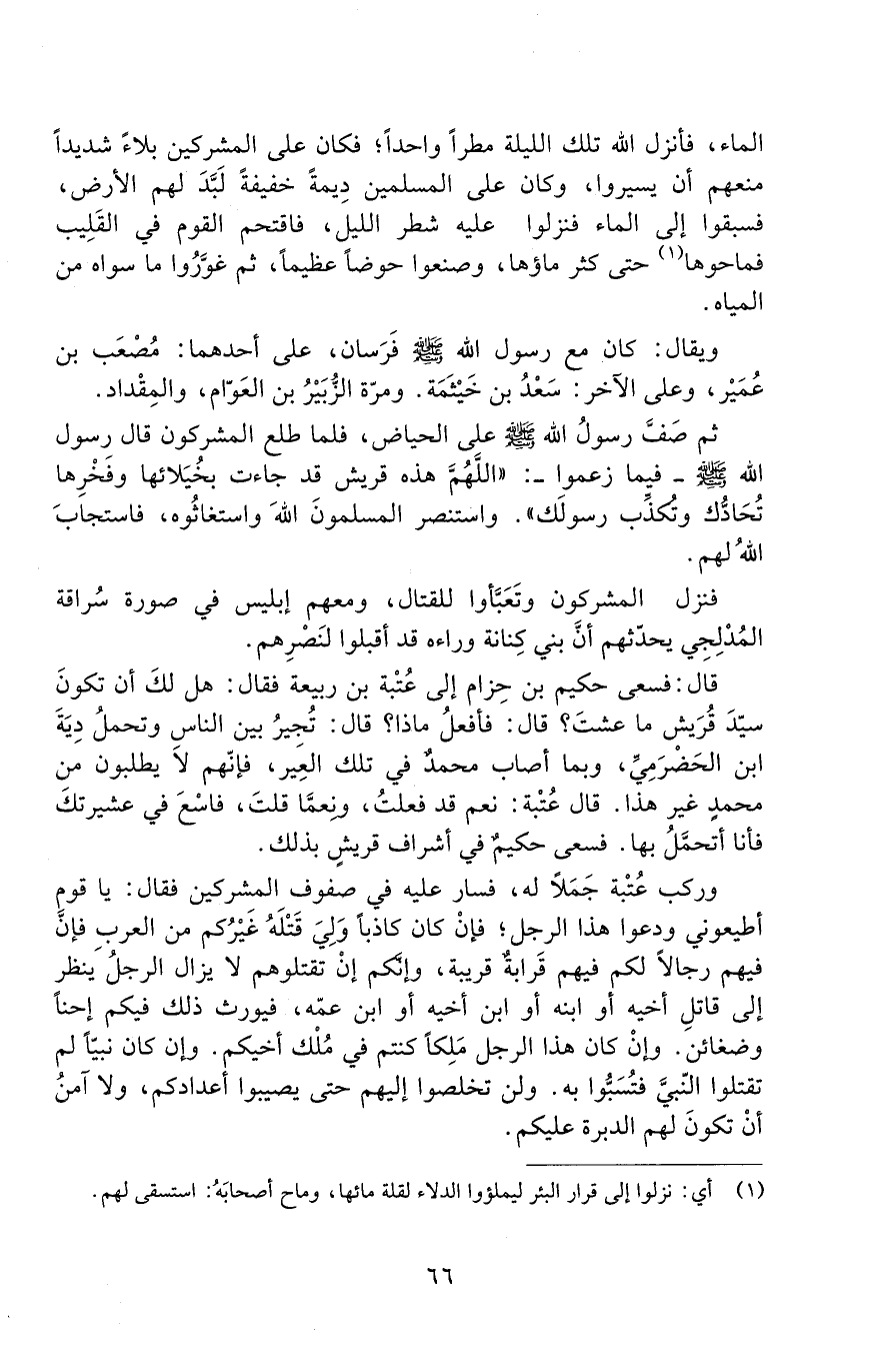 قَالَ: فَسَعَى حَكِيمُ بْنُ حِزَامٍ إِلَى عُتْبَةَ بْنِ رَبِيعَةَ فَقَالَ: هَلْ لَكَ أَنْ تكون سيد قريش ما عشت؟ قال: فَأَفْعَلُ مَاذَا؟ قَالَ: تُجِيُر بَيْنَ النَّاسِ وَتَحْمِلُ دِيَةَ ابْنِ الْحَضْرَمِيِّ، وَبِمَا أَصَابَ مُحَمَّدٌ فِي تِلْكَ الْعِيرِ، فَإِنَّهُمْ لَا يَطْلُبُونَ مِنْ مُحَمِّدٍ غيرها. قال عتبة: نعم قد فعلت، ونعما قُلْتَ، فَاسْعَ فِي عَشِيرَتِكَ فَأَنا أَتَحَمَّلُ بِهَا. فَسَعَى حَكِيمٌ فِي أَشْرَافِ قُرَيشٍ بِذَلِكَ.