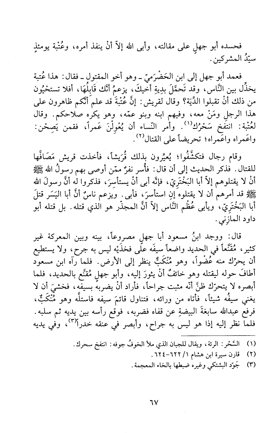 وقام رجل فَتَكَشَّفُوا؛ يُعَيِّرُونَ بِذَلِكَ قُرَيْشًا. فَأَخَذَتْ قُرَيْشٌ مَصَافَّهَا لِلْقِتَالِ. فَذَكَرَ الْحَدِيثَ إِلَى أَنْ قَالَ: فَأُسِرَ نَفَرٌ مِمَّنْ أَوْصَى بِهِمْ رَسُولُ اللَّهِ - صَلَّى اللَّهُ عَلَيْهِ وَسَلَّمَ - أَنْ لَا يَقْتُلُوهُمْ إِلَّا أَبَا الْبَخْتَرِيِّ، فَإِنَّهُ أَبَى أَنْ يُسْتَأْسَرَ، فَذَكَرُوا لَهُ أَنَّ رَسُولَ اللَّهِ - صَلَّى اللَّهُ عَلَيْهِ وَسَلَّمَ - قَدْ أَمَرَهُمْ أَنْ لَا يَقْتُلُوهُ إِنِ اسْتَأْسَرَ، فَأَبَى. وَيَزْعُمُ نَاسٌ أَنَّ أَبَا الْيسرِ قَتَلَ أَبَا الْبَخْتَرِيِّ. وَيَأْبَى عُظْمُ النَّاسُ إِلَّا أَنَّ الْمُجَذَّرَ هُوَ الَّذِي قَتَلَهُ. بَلْ قَتَلَهُ أَبُو دَاوُدَ الْمَازِنِيُّ.