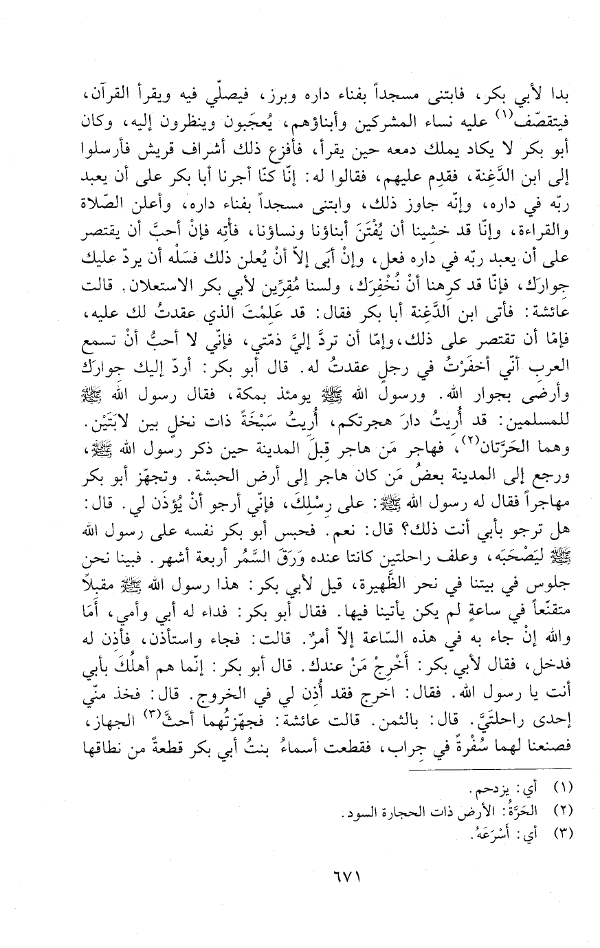 قَالَتْ عَائِشَةُ: فَأَتَى ابْنُ الدَّغِنَةَ أَبَا بَكْرٍ فَقَالَ: قَدْ عَلِمْتَ الَّذِي عَقَدْتُ لَكَ عَلَيْهِ، فَإِمَّا أَنْ تَقْتَصِرَ عَلَى ذَلِكَ، وَإِمَّا أَنْ تَرُدَّ إِلَيَّ ذِمَّتِي، فَإِنِّي لَا أُحِبُّ أَنْ تَسْمَعَ الْعَرَبُ أَنِّي أُخْفِرْتُ فِي رَجُلٍ عَقَدْتُ لَهُ، قَالَ أَبُو بَكْرٍ: أَرُدُّ إِلَيْكَ جِوَارَكَ وَأَرْضَى بِجِوَارِ الله. ورسول الله صَلَّى اللَّهُ عَلَيْهِ وَسَلَّمَ يَوْمَئِذٍ بِمَكَّةَ، فَقَالَ النَّبِيُّ صَلَّى اللَّهُ عَلَيْهِ وَسَلَّمَ لِلْمُسْلِمِينَ: قَدْ أُرِيتُ دَارَ هِجْرَتِكُمْ، أُرِيتُ سَبْخَةً ذَاتَ نَخْلٍ بَيْنَ لَابَتَيْنِ. وَهُمَا الْحَرَّتَانِ، فَهَاجَرَ مَنْ هَاجَرَ قبل المدينة حِينَ ذَكَرَ رَسُولَ اللَّهِ صَلَّى اللَّهُ عَلَيْهِ وَسَلَّمَ، وَرَجَعَ إِلَى الَمَدِينَةِ بَعْضُ مَنْ كَانَ هَاجَرَ إِلَى أَرْضِ الْحَبَشَةِ.