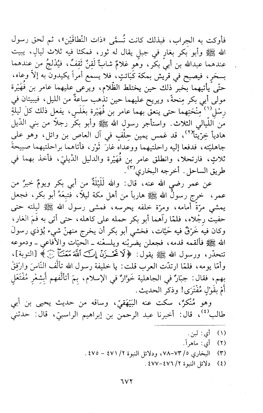 فَأَوْكَتْ بِهِ الْجِرَابَ، فَبِذَلِكَ كَانَتْ تُسَمَّى ذَاتَ النِّطَاقَيْنِ، ثُمَّ لَحِقَ رَسُولُ اللَّهِ صَلَّى اللَّهُ عَلَيْهِ وَسَلَّمَ وَأَبُو بَكْرٍ بِغَارٍ فِي جَبَلٍ يُقَالُ لَهُ ثَوْرُ، فَمَكَثَا فِيهِ ثَلاثَ لَيَالٍ، يَبِيتُ عِنْدَهُمَا عَبْدُ اللَّهِ بْنُ أَبِي بَكْرٍ، وَهُوَ غُلَامٌ شَابٌّ لَقِنٌ ثَقِفٌ، فَيُدْلِجُ مِنْ عِنْدِهِمَا بِسَحَرٍ، فَيُصْبِحُ فِي قُرَيْشٍ بِمَكَّةَ كَبَائِتٍ، فَلَا يَسْمَعُ أَمْرًا يَكِيدُونَ بِهِ إِلَّا وَعَاهُ، حَتَّى يَأْتِيَهُمَا بِخَبَرِ ذَلِكَ حِينَ يَخْتَلِطُ الظَّلامُ، ويرعى عليها عَامِرُ بْنُ فُهَيْرَةَ مَوْلَى أَبِي بَكْرٍ مِنْحَةً، وَيُرِيحُ عَلَيْهِمَا حِينَ تَذْهَبُ سَاعَةٌ مِنَ الْعِشَاءِ فَيَبِيتَانِ فِي رِسْلِ مِنْحَتِهِمَا حَتَّى يَنْعِقَ بِهِمَا عَامِرُ بْنُ فُهَيْرَةَ بِغَلَسٍ، يَفْعَلُ ذَلِكَ كُلَّ لَيْلَةٍ مِنَ اللَّيَالِي الثَّلاثِ، وَاسْتَأْجَرَ رَسُولُ اللَّهِ صَلَّى اللَّهُ عَلَيْهِ وَسَلَّمَ وَأَبُو بَكْرٍ رَجُلا من بني الدّيل هاديا خرّيتا، قد غَمَسَ يَمِينَ حِلْفٍ فِي آلِ الْعَاصِ بْنِ وَائِلٍ، وَهُوَ عَلَى جَاهِلِيَّتِهِ، فَدَفَعَا إِلَيْهِ رَاحِلَتَيْهِمَا وَوَاعَدَاهُ غَارَ ثَوْرٍ، فَأَتَاهُمَا بِرَاحِلَتَيْهِمَا صَبِيحَةَ ثَلَاثٍ، فارتحلا، وانطلق عامر بن فهيرة والدليل الدّيليّ، فَأَخَذَ بِهِمَا فِي طَرِيقِ السَّاحِلِ. أَخْرَجَهُ الْبُخَارِيُّ.