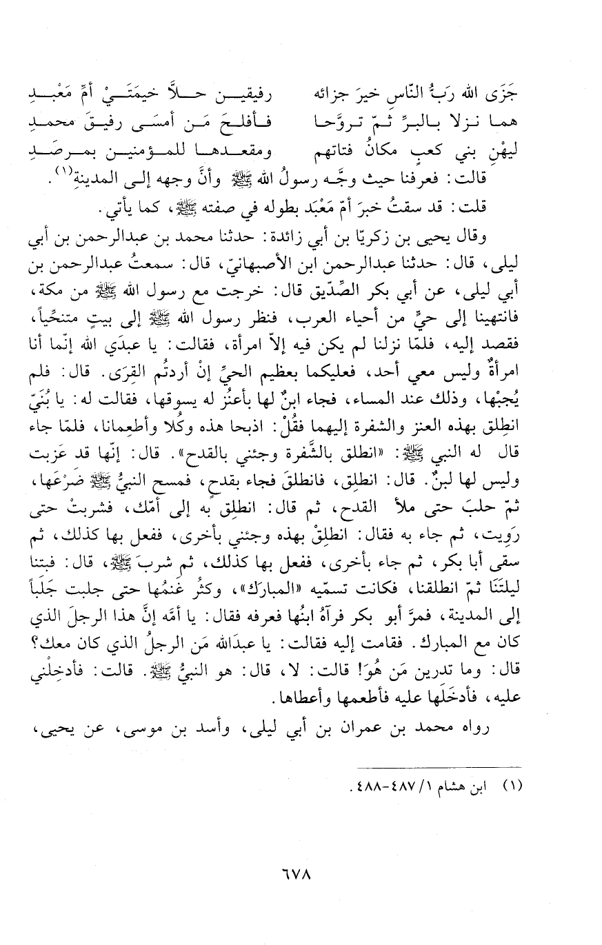 وَقَالَ يَحْيَى بْنُ زَكَرِيَّا بْنِ أَبِي زَائِدَةَ: حدثنا مُحَمَّدُ بْنُ عَبْدِ الرَّحْمَنِ بْنِ أَبِي لَيْلَى، قال: حدثنا عَبْدُ الرَّحْمَنِ بْنُ الْأَصْبَهَانِيِّ قَالَ: سَمِعْتُ عَبْدَ الرَّحْمَنِ بْنَ أَبِي لَيْلَى، عَنْ أَبِي بَكْرٍ الصّدّيق قَالَ: خَرَجْتُ مَعَ رَسُولِ اللَّهِ صَلَّى اللَّهُ عَلَيْهِ وَسَلَّمَ من مكة، فانتهينا إلى حي من أحياء العرب، فَنَظَرَ رَسُولُ اللَّهِ صَلَّى اللَّهُ عَلَيْهِ وَسَلَّمَ إِلَى بيت متنحيا، فَقَصَدَ إِلَيْهِ، فَلَمَّا نَزَلْنَا لَمْ يَكُنْ فِيهِ إِلَّا امْرَأَةٌ، فَقَالَتْ: يَا عَبْدَيِ اللَّهِ إِنَّمَا أنا امرأة وليس مَعِي أَحَدٌ، فَعَلَيْكُمَا بِعَظِيمِ الْحَيِّ إِنْ أَرَدْتُمُ الْقِرَى، قَالَ: فَلَمْ يُجِبْهَا، وَذَلِكَ عِنْدَ الْمَسَاءِ، فَجَاءَ ابْنٌ لَهَا بِأَعْنُزٍ لَهُ يَسُوقُهَا، فَقَالَتْ لَهُ: يَا بُنَيَّ انْطَلِقْ بِهَذِهِ الْعَنَزِ وَالشَّفْرَةِ إِلَيْهِمَا فَقُلْ: اذْبَحَا هَذِهِ وَكُلَا وَأَطْعِمَانَا، فَلَمَّا جاء قَالَ لَهُ النَّبِيُّ صَلَّى اللَّهُ عَلَيْهِ وَسَلَّمَ: " انْطَلِقْ بِالشَّفْرَةِ وَجِئْنِي بِالْقَدَحِ "، قَالَ: إِنَّهَا قَدْ عزبت وليس بها لَبَنٌ، قَالَ: انْطَلِقْ، فَانْطَلَقَ فَجَاءَ بِقَدَحٍ، فَمَسَحَ النَّبِيُّ صَلَّى اللَّهُ عَلَيْهِ وَسَلَّمَ ضَرْعَهَا، ثُمَّ حَلَبَ حَتَّى مَلَأَ الْقَدَحَ، ثُمَّ قَالَ: انْطَلِقْ بِهِ إِلَى أُمِّكَ، فَشَرِبَتْ حَتَّى رَوِيَتْ، ثُمَّ جَاءَ بِهِ فَقَالَ: انْطَلِقْ بِهَذِهِ وَجِئْنِي بِأُخْرَى، فَفَعَلَ بِهَا كَذَلِكَ، ثُمَّ سَقَى أَبَا بَكْرٍ، ثُمَّ جَاءَ بِأُخْرَى، فَفَعَلَ بِهَا كَذَلِكَ، ثُمَّ شَرِبَ صَلَّى اللَّهُ عَلَيْهِ وَسَلَّمَ، قَالَ: فَبِتْنَا لَيْلَتَنَا ثُمَّ انْطَلَقْنَا، فَكَانَتْ تُسَمِّيهِ الْمُبَارَكَ، وَكَثُرَ غَنَمُهَا حَتَّى جَلَبَتْ جَلْبًا إِلَى الْمَدِينَةِ، فَمَرَّ أَبُو بَكْرٍ فَرَآهُ ابْنُهَا فَعَرَفَهُ فَقَالَ: يَا أُمَّهُ إِنَّ هَذَا الرَّجُلَ الَّذِي كَانَ مَعَ الْمُبَارَكِ، فَقَامَتْ إِلَيْهِ فَقَالَتْ: يَا عَبْدَ اللَّهِ مَنِ الرَّجُلُ الَّذِي كَانَ مَعَكَ؟ قَالَ: وَمَا تَدْرِينَ مَنْ هُوَ! قَالَتْ: لَا، قَالَ: هُوَ النَّبِيُّ صَلَّى اللَّهُ عَلَيْهِ وَسَلَّمَ، قَالَتْ: فَأَدْخِلْنِي عَلَيْهِ، فَأَدْخَلَهَا عَلَيْهِ فَأَطْعَمَهَا وَأَعْطَاهَا.