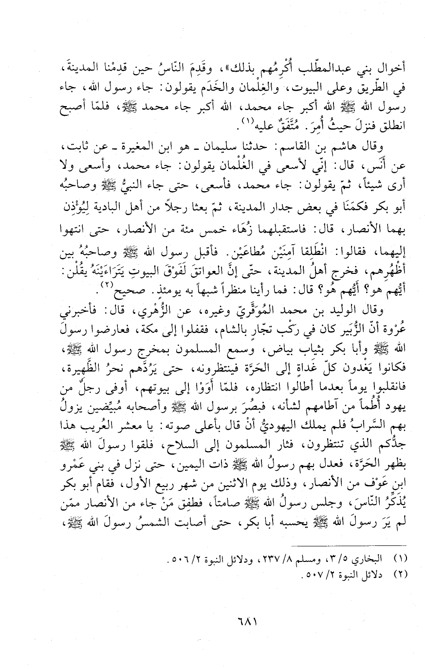 وقال هاشم بن القاسم: حدثنا سُلَيْمَانُ هُوَ ابْنُ الْمُغِيرَةِ عَنْ ثَابِتٍ، عَنْ أَنَسٍ، قَالَ: إِنِّي لَأَسْعَى فِي الْغِلْمَانِ يَقُولُونَ: جَاءَ مُحَمَّدٌ، وَأَسْعَى وَلَا أَرَى شَيْئًا، ثُمَّ يَقُولُونَ: جَاءَ مُحَمَّدٌ، فَأَسْعَى، حَتَّى جَاءَ النَّبِيُّ صَلَّى اللَّهُ عَلَيْهِ وَسَلَّمَ وَصَاحِبُهُ أَبُو بَكْرٍ فكمنا في بعض جدار الْمَدِينَةِ، ثُمَّ بَعَثَا رَجُلًا مِنْ أَهْلِ الْبَادِيَةِ لِيُؤْذِنَ بِهِمَا الْأَنْصَارَ قَالَ: فَاسْتَقْبَلَهُمَا زُهَاءَ خُمْسُمِائَةٍ مِنَ الْأَنْصَارِ، حَتَّى انْتَهَوْا إِلَيْهِمَا، فَقَالُوا: انْطَلِقَا آمِنَيْنِ مُطَاعَيْنِ، فَأَقْبَلَ رَسُولُ اللَّهِ صَلَّى اللَّهُ عَلَيْهِ وَسَلَّمَ وَصَاحِبُهُ بَيْنَ أَظْهُرِهِمْ، فَخَرَجَ أَهْلُ الْمَدِينَةِ، حَتَّى إِنَّ الْعَوَاتِقَ لَفَوْقَ الْبُيُوتِ يَتَرَاءَيْنَهُ يقلن: أيّهم هو؟ أيّهم هو؟ قال: فما رأينا منظرا شبها بِهِ يَوْمَئِذٍ. صَحِيحٌ.