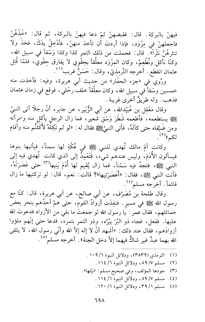 فِيهِنَّ بِالْبَرَكَةِ، قَالَ: فَقَبَضَهُنَّ ثُمَّ دَعَا فِيهِنَّ بِالْبَرَكَةِ، ثُمَّ قَالَ: " خُذْهُنَّ فَاجْعَلْهُنَّ فِي مِزْوَدٍ، فَإِذَا أَرَدْتَ أَنْ تَأْخُذَ مِنْهُنَّ، فَأَدْخِلْ يَدَكَ، فَخُذْ وَلَا تَنْثُرُهُنَّ نَثْرًا " قَالَ: فَحَمَلْتُ مِنْ ذَلِكَ التَّمْرِ كَذَا وَكَذَا وَسْقًا فِي سَبِيلِ اللَّهِ، وَكُنَّا نَأْكُلُ وَنُطْعِمُ، وَكَانَ الْمِزْوَدُ مُعَلَّقًا بِحَقْوِي لا يُفَارِقُ حَقْوِي، فَلَمَّا قُتِلَ عُثْمَانُ انْقَطَعَ. أَخْرَجَهُ التِّرْمِذِيُّ وَقَالَ: حَسَنٌ غَرِيبٌ.