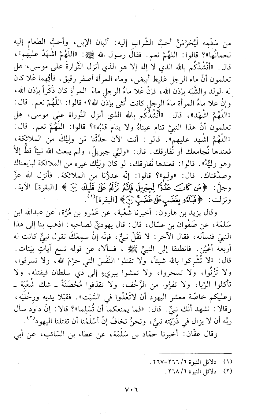 مِنْ سَقَمِهِ لَيُحَرِّمَنَّ أَحَبَّ الشَّرَابِ إِلَيْهِ: أَلْبَانُ الْإِبِلِ، وَأَحَبَّ الطَّعَامِ إِلَيْهِ لَحْمَانُهَا "؟ قَالُوا: اللَّهُمَّ نَعَمْ، فَقَالَ رَسُولُ اللَّهِ صَلَّى اللَّهُ عَلَيْهِ وَسَلَّمَ: " اللَّهُمَّ اشْهَدْ عَلَيْهِمْ "، قَالَ: أَنْشُدُكُمْ بِاللَّهِ الَّذِي لَا إِلَهَ إِلَّا هُوَ الَّذِي أَنْزَلَ التَّوْرَاةَ عَلَى مُوسَى، هَلْ تَعْلَمُونَ أَنَّ مَاءَ الرَّجُلِ غَلِيظٌ أَبْيَضُ، وَمَاءَ الْمَرْأَةِ أَصْفَرُ رَقِيقٌ، فَأَيُّهُمَا عَلَا كَانَ لَهُ الْوَلَدُ وَالشَّبَهُ بِإِذْنِ اللَّهِ، فَإِنْ عَلَا مَاءُ الرَّجُلِ مَاءَ الْمَرْأَةِ كَانَ ذَكَرًا بِإِذْنِ اللَّهِ، وَإِنْ عَلَا مَاءُ الْمَرْأَةِ مَاءَ الرَّجُلِ كَانَتْ أُنْثَى بِإِذْنِ اللَّهِ "؟ قَالُوا: اللَّهُمَّ نَعَمْ، قَالَ: " اللَّهُمَّ اشْهَدْ "، قَالَ: أَنْشُدُكُمْ بِاللَّهِ الَّذِي أَنْزَلَ التَّوْرَاةَ عَلَى مُوسَى، هَلْ تَعْلَمُونَ أَنَّ هَذَا النَّبِيَّ تَنَامُ عَيْنَاهُ وَلَا يَنَامُ قَلْبُهُ "؟ قَالُوا: اللَّهُمَّ نَعَمْ، قَالَ: " اللَّهُمَّ اشْهَدْ عَلَيْهِمْ ". قَالُوا: أَنْتَ الْآنَ حَدِّثْنَا مَنْ وَلِيُّكَ مِنَ الْمَلَائِكَةِ، فَعِنْدَهَا نُجَامِعُكَ أَوْ نُفَارِقُكَ، قَالَ: " وَلِيِّي جِبْرِيلُ، وَلَمْ يَبْعَثِ اللَّهُ نَبِيًّا قَطُّ إِلَّا وَهُوَ وَلِيُّهُ "، قَالُوا: فَعِنْدَهَا نُفَارِقُكَ، لَوْ كَانَ وَلِيُّكَ غَيْرَهُ مِنَ الْمَلَائِكَةِ لبايعناك وصدّقناك، قال: " وَلِمَ "؟ قَالُوا: إِنَّهُ عَدُوُّنَا مِنَ الْمَلَائِكَةِ. فَأَنْزَلَ اللَّهُ عَزَّ وَجَلَّ: " مَنْ كَانَ عَدُوًّا لِجِبْرِيلَ فَإِنَّهُ نَزَّلَهُ عَلَى قَلْبِكَ " الآيَةَ. وَنَزَلَتْ " فَبَاءُوا بِغَضَبٍ عَلَى غَضَبٍ ".