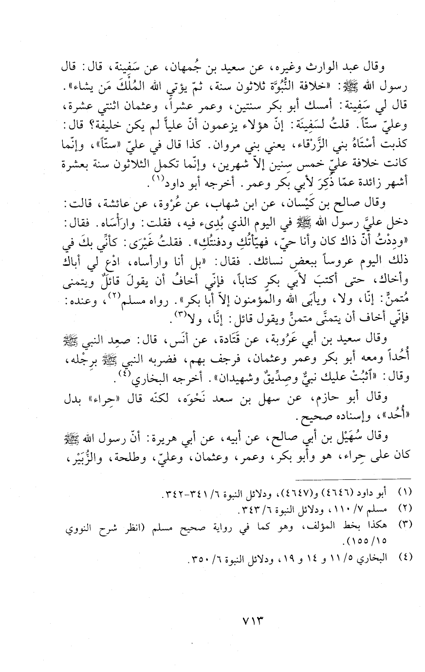 قَالَ لِي سَفِينَةُ: أَمْسَكَ أَبُو بَكْرٍ سَنَتَيْنِ، وَعُمَرُ عشرا، وعثمان اثنتي عشرة، وَعَلِيٌّ سِتًّا. قُلْتُ لِسَفِينَةَ: إِنَّ هَؤُلَاءِ يَزْعُمُونَ أَنَّ عَلِيًّا لَمْ يَكُنْ خَلِيفَةً، قَالَ: كَذَبَتْ أَسْتَاهُ بَنِي الزَّرْقَاءِ، يَعْنِي بَنِي مَرْوَانَ. كَذَا قَالَ فِي عَلِيٍّ سِتًّا، وَإِنَّمَا كَانَتْ خِلَافَةُ عَلِيٍّ خَمْسَ سِنِينَ إِلَّا شَهْرَيْنِ، وَإِنَّمَا تَكْمُلُ الثَّلَاثُونَ سَنَةً بِعَشَرَةِ أَشْهُرٍ زَائِدَةٍ عَمَّا ذُكِرَ لأَبِي بَكْرٍ وَعُمَرَ. أَخْرَجَهُ أَبُو دَاوُدَ.