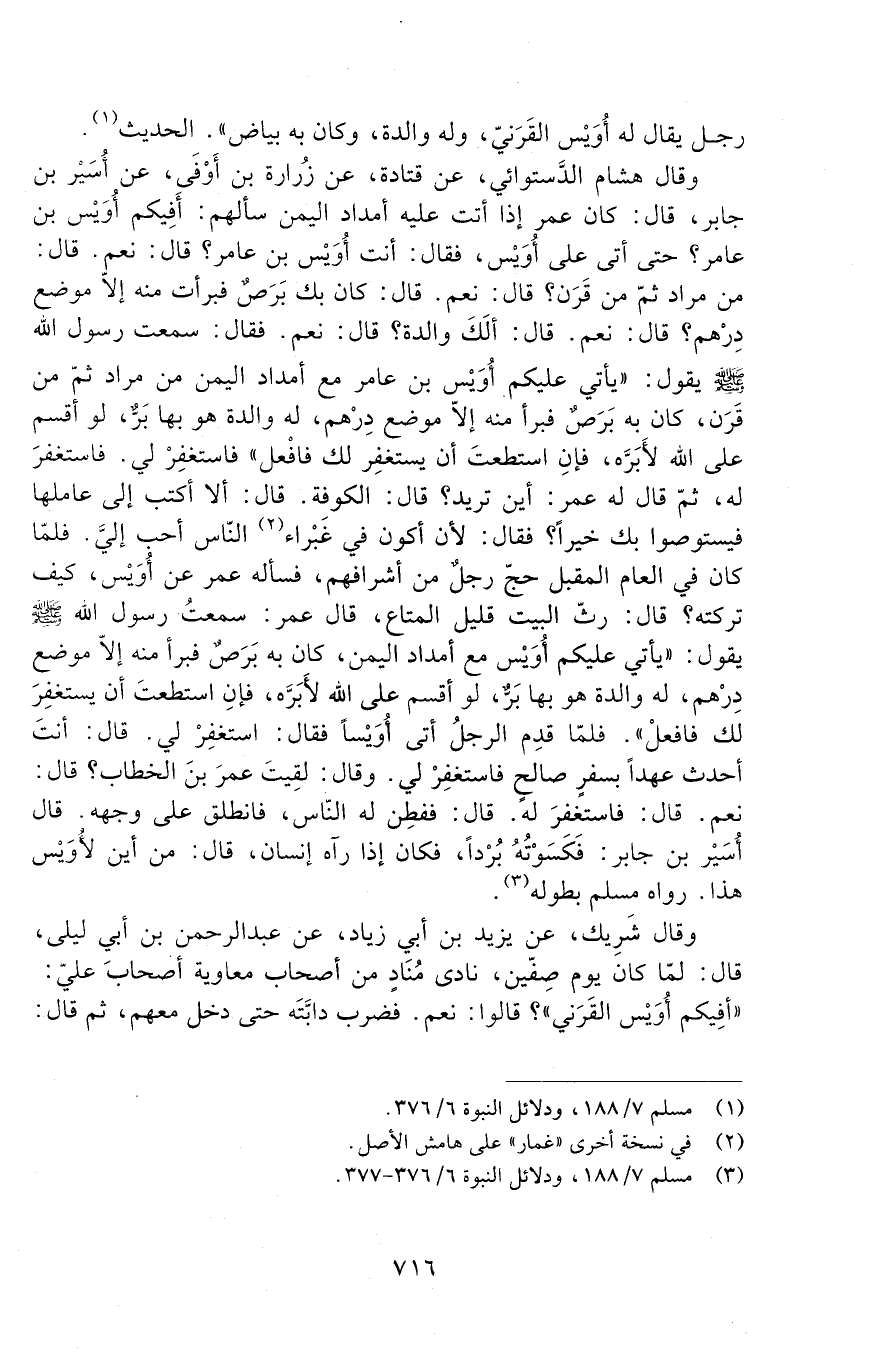 وَقَالَ هِشَامٌ الدَّسْتُوَائِيُّ، عَنْ قَتَادَةَ، عَنْ زُرَارَةَ بْنِ أَوْفَى، عَنْ أُسَيْرِ بْنِ جَابِرٍ قَالَ: كَانَ عُمَرُ إِذَا أَتَتْ عَلَيْهِ أَمْدَادُ الْيَمَنِ سَأَلَهُمْ: أَفِيكُمْ أُوَيْسُ بْنُ عَامِرٍ؟ حَتَّى أَتَى عَلَى أُوَيْسٍ فَقَالَ: أَنْتَ أُوَيْسُ بْنُ عَامِرٍ؟ قَالَ: نَعَمْ، قَالَ: مِنْ مُرَادٍ ثُمَّ مِنْ قَرَنٍ؟ قَالَ: نَعَمْ، قَالَ: كَانَ بِكَ بَرَصٌ فَبَرَأْتَ مِنْهُ إِلَّا مَوْضِعَ دِرْهَمٍ؟ قَالَ: نَعَمْ، قَالَ: أَلَكَ وَالِدَةٌ؟ قَالَ: نَعَمْ، فَقَالَ: سَمِعْتُ رَسُولَ اللَّهِ صَلَّى اللَّهُ عَلَيْهِ وَسَلَّمَ يقول: " يأتي عليكم أويس بن عامر مع أمداد الْيَمَنِ مِنْ مُرَادٍ ثُمَّ مِنْ قَرَنٍ، كَانَ بِهِ بَرَصٌ فَبَرَأَ مِنْهُ إِلَّا مَوْضِعَ دِرْهَمٍ، له والدة هو بها بر، لو أقسم عَلَى اللَّهِ لَأَبَرَّهُ، فَإِنِ اسْتَطَعْتَ أَنْ يَسْتَغْفِرَ لَكَ فَافْعَلْ " فَاسْتَغْفِرْ لِي، فَاسْتَغْفَرَ لَهُ، ثُمَّ قَالَ لَهُ عُمَرُ: أَيْنَ تُرِيدُ؟ قَالَ: الْكُوفَةَ، قَالَ: أَلَا أَكْتُبُ لَكَ إِلَى عَامِلِهَا فَيَسْتَوْصُوا بِكَ خَيْرًا؟ فَقَالَ: لَأَنْ أَكُونَ فِي غَبْرَاءِ النَّاسِ أَحَبُّ إِلَيَّ، فَلَمَّا كَانَ فِي الْعَامِ الْمُقْبِلِ حَجَّ رَجُلٌ مِنْ أَشْرَافِهِمْ، فَسَأَلَهُ عُمَرُ عَنْ أُوَيْسٍ، كَيْفَ تَرَكْتَهُ؟ قَالَ: رَثَّ الْبَيْتِ قَلِيلَ الْمَتَاعِ، قَالَ عُمَرُ: سَمِعْتُ رَسُولَ اللَّهِ صَلَّى اللَّهُ عَلَيْهِ وَسَلَّمَ يَقُولُ: " يَأْتِي عَلَيْكُمْ أُوَيْسٌ مَعَ أَمْدَادِ الْيَمَنِ، كَانَ بِهِ بَرَصٌ فبرأ منه إلا موضع درهم، له والدة هُوَ بِهَا بَرٌّ، لَوْ أَقْسَمَ عَلَى اللَّهِ لَأَبَرَّهُ، فَإِنِ اسْتَطَعْتَ أَنْ يَسْتَغْفِرَ لَكَ فَافْعَلْ " فَلَمَّا قَدِمَ الرَّجُلُ أَتَى أُوَيْسًا فَقَالَ: اسْتَغْفِرْ لِي، قَالَ: أَنْتَ أَحْدَثُ عَهْدًا بِسَفَرٍ صَالِحٍ فَاسْتَغْفِرْ لِي، وَقَالَ: لَقِيتَ عُمَرَ بْنَ الْخَطَّابِ؟ قَالَ: نَعَمْ، قَالَ: فَاسْتَغْفِرْ لَهُ، قَالَ: فَفَطِنَ لَهُ النَّاسُ، فَانْطَلَقَ عَلَى وَجْهِهِ. قَالَ أُسَيْرُ بْنُ جَابِرٍ: فَكَسَوْتُهُ بُرْدًا، فَكَانَ إِذَا رَآهُ إِنْسَانٌ قَالَ: مِنْ أَيْنَ لِأُوَيْسٍ هَذَا. رَوَاهُ مُسْلِمٌ بِطُولِهِ.