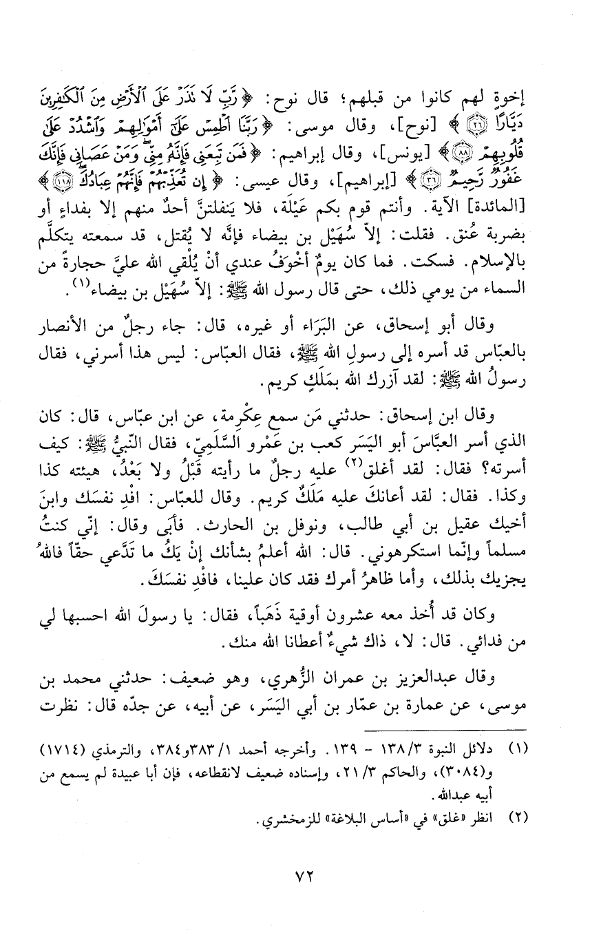 إِخْوَةٍ لَهُمْ كَانُوا مِنْ قَبْلِهِمْ؛ قَالَ نُوحٌ: " رَبِّ لا تَذَرْ عَلَى الأَرْضِ مِنَ الْكَافِرِينَ دَيَّارًا "، وَقَالَ مُوسَى: " رَبَّنَا اطْمِسْ عَلَى أَمْوَالِهِمْ وَاشْدُدْ عَلَى قُلُوبِهِمْ "، وَقَالَ إِبْرَاهِيمُ: " فَمَنْ تَبِعَنِي فَإِنَّهُ مِنِّي وَمَنْ عَصَانِي فَإِنَّكَ غَفُورٌ رَحِيمٌ "، وقال عيسى: " إن تعذبهم فإنهم عبادك " الآية. وأنتم قوم بكم عيلة، فلا ينفلتن أَحَدٌ مِنْهُمْ إِلَّا بِفِدَاءٍ أَوْ بِضَرْبَةِ عُنُقٍ. فَقُلْتُ: إِلَّا سُهَيْلُ بْنُ بَيْضَاءَ فَإِنَّهُ لَا يُقْتَلُ، قَدْ سَمِعْتُهُ يَتَكَلَّمُ بِالإِسْلامِ. فَسَكَتَ. فَمَا كَانَ يَوْمٌ أَخْوَف عِنْدِي أَنْ يُلْقِيَ اللَّهُ عَلَيَّ حِجَارَةً مِنَ السَّمَاءِ مِنْ يَوْمِي ذَلِكَ، حَتَّى قَالَ رَسُولُ اللَّهِ - صَلَّى اللَّهُ عَلَيْهِ وَسَلَّمَ -: إِلَّا سُهَيْلُ بْنُ بَيْضَاءَ.