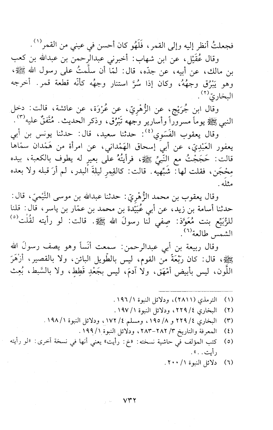 وقال يعقوب الفسوي: حدثنا سعيد، قال: حدثنا يُونُسُ بْنُ أَبِي يَعْفُورَ الْعَبْدِيُّ، عَنْ أَبِي إِسْحَاقَ الْهَمْدَانِيِّ، عَنِ امْرَأَةٍ مِنْ هَمْدَانَ سَمَّاهَا قَالَتْ: حَجَجْتُ مَعَ النَّبِيِّ - صَلَّى اللَّهُ عَلَيْهِ وَسَلَّمَ -، فَرَأَيْتُهُ عَلَى بَعِيرٍ لَهُ يَطُوفُ بِالْكَعْبَةَ، بِيَدِهِ مِحْجَنٌ، فَقُلْتُ لَهَا: شَبِّهِيهِ، قَالَتْ: كَالْقَمَرِ لَيْلَةَ الْبَدْرِ، لَمْ أَرَ قَبْلَهُ وَلَا بَعْدَهُ مثله.