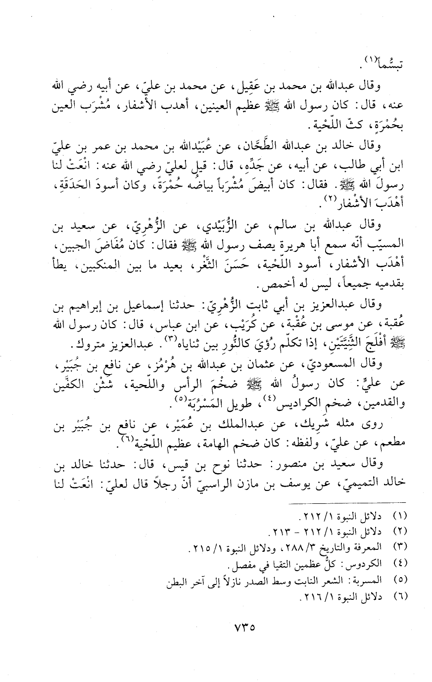 وَقَالَ خَالِدُ بْنُ عَبْدِ اللَّهِ الطَّحَّانُ، عَنْ عُبَيْدِ اللَّهِ بْنِ مُحَمَّدِ بْنِ عُمَرَ بْنِ عَلِيِّ بْنِ أَبِي طَالِبٍ، عَنْ أَبِيهِ، عَنْ جَدِّهِ قَالَ: قِيلَ لِعَلِيٍّ - رضي الله عنه -: انْعَتْ لَنَا رَسُولَ اللَّهِ - صَلَّى اللَّهُ عَلَيْهِ وَسَلَّمَ - فَقَالَ: كَانَ أَبْيَضَ مُشْرَبًا بَيَاضُهُ حُمْرَةً، وَكَانَ أَسْوَدَ الْحَدَقَةِ، أَهْدَبَ الْأَشْفَارِ.