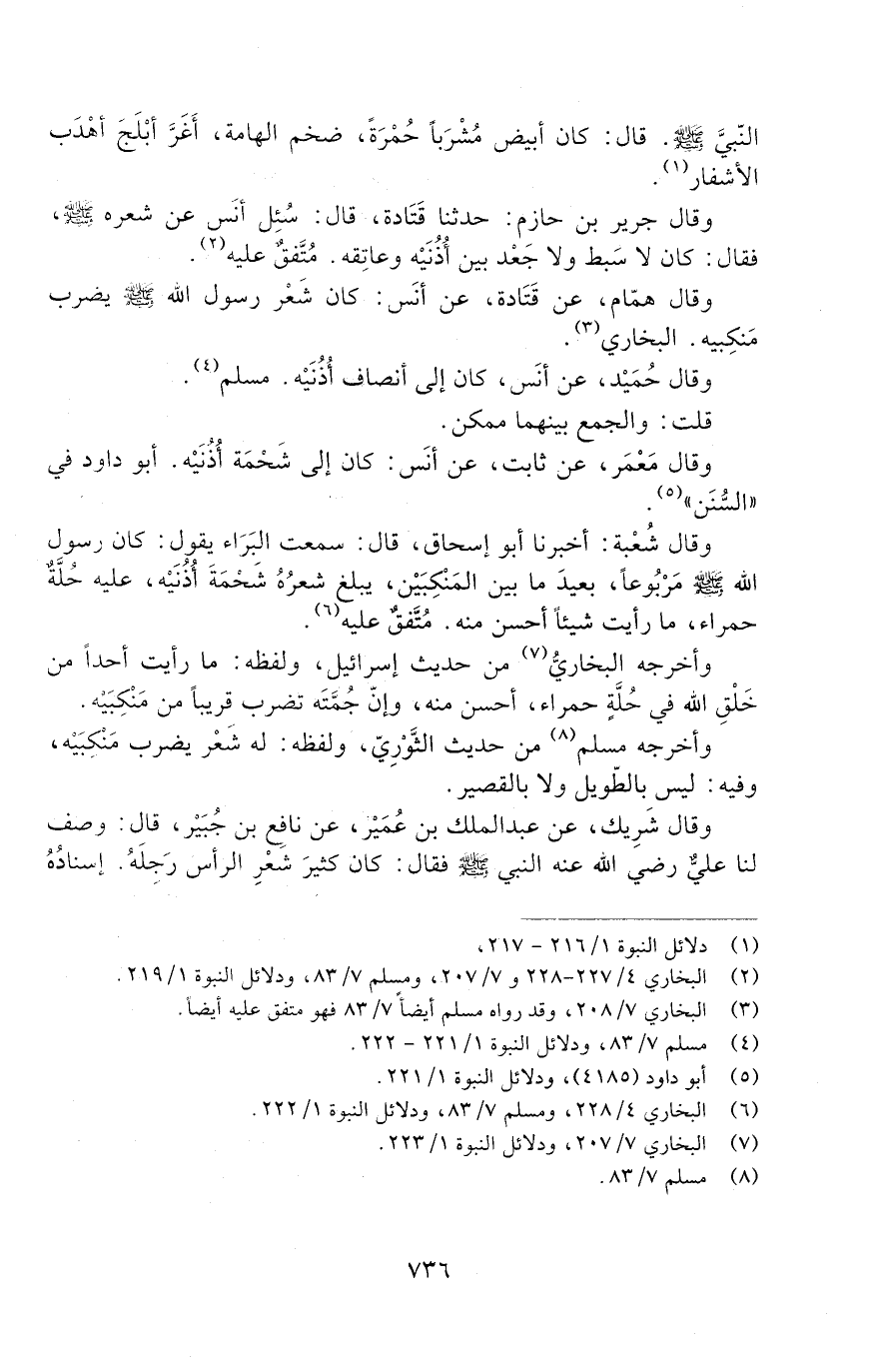 النَّبِيِّ - صَلَّى اللَّهُ عَلَيْهِ وَسَلَّمَ - قَالَ: كَانَ أَبْيَضَ مُشْرَبًا حُمْرَةً، ضَخْمَ الْهَامَةِ، أَغَرَّ أَبْلَجَ أهدب الأشفار.