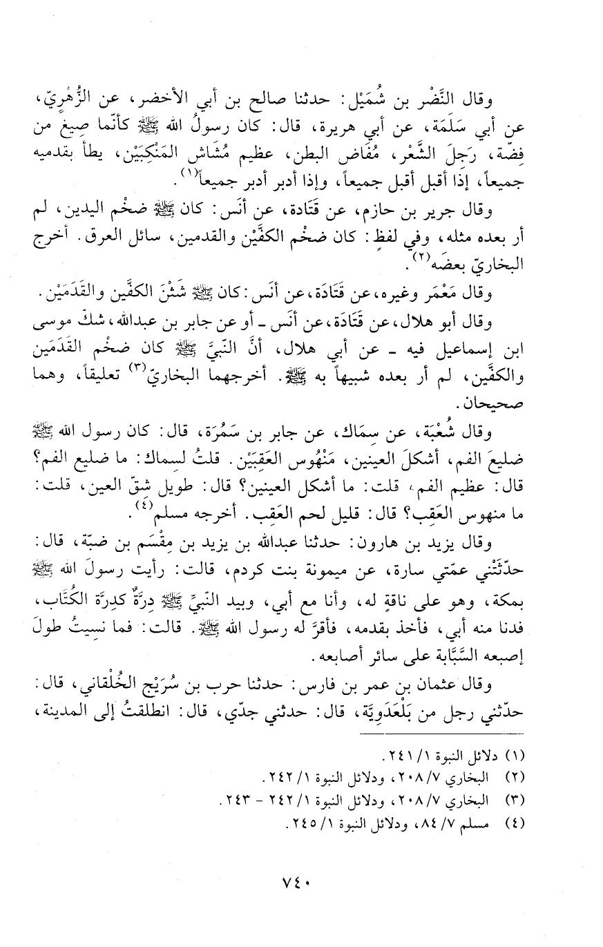 وَقَالَ أَبُو هِلَالٍ، عَنْ قَتَادَةَ، عَنْ أَنَسٍ - أَوْ عَنْ جَابِرِ بْنِ عَبْدِ اللَّهِ، شَكَّ مُوسَى بْنُ إِسْمَاعِيلَ فِيهِ - عَنْ أَبِي هِلَالٍ، أَنَّ النَّبِيَّ - صَلَّى اللَّهُ عَلَيْهِ وَسَلَّمَ - كَانَ ضَخْمَ الْقَدَمَيْنِ والكفيّن، لم أَرَ بَعْدَهُ شَبِيهًا بِهِ - صَلَّى اللَّهُ عَلَيْهِ وَسَلَّمَ -. أَخْرَجَهُمَا الْبُخَارِيُّ تَعْلِيقًا، وَهُمَا صَحِيحَانِ.