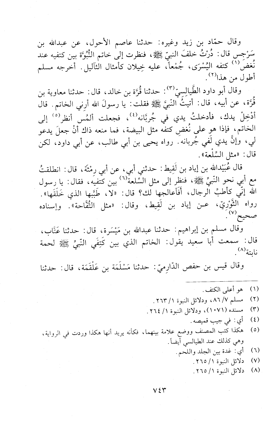 وقال حمّاد بن زيد، وغيره: حدثنا عَاصِمٌ الْأَحْوَلُ، عَنْ عَبْدِ اللَّهِ بْنِ سَرْجِسٍ قَالَ: دُرْتُ خَلْفَ النَّبِيِّ - صَلَّى اللَّهُ عَلَيْهِ وَسَلَّمَ -، فَنَظَرْتُ إِلَى خَاتَمِ النُّبُوَّةِ بَيْنَ كَتِفَيْهِ عِنْدَ نُغْضِ كَتِفِهِ الْيُسْرَى. جُمْعًا، عَلَيْهِ خِيلَانٌ كَأَمْثَالِ الثَّآلِيلِ. أَخْرَجَهُ مُسْلِمٌ أَطْوَلَ مِنْ هَذَا.
