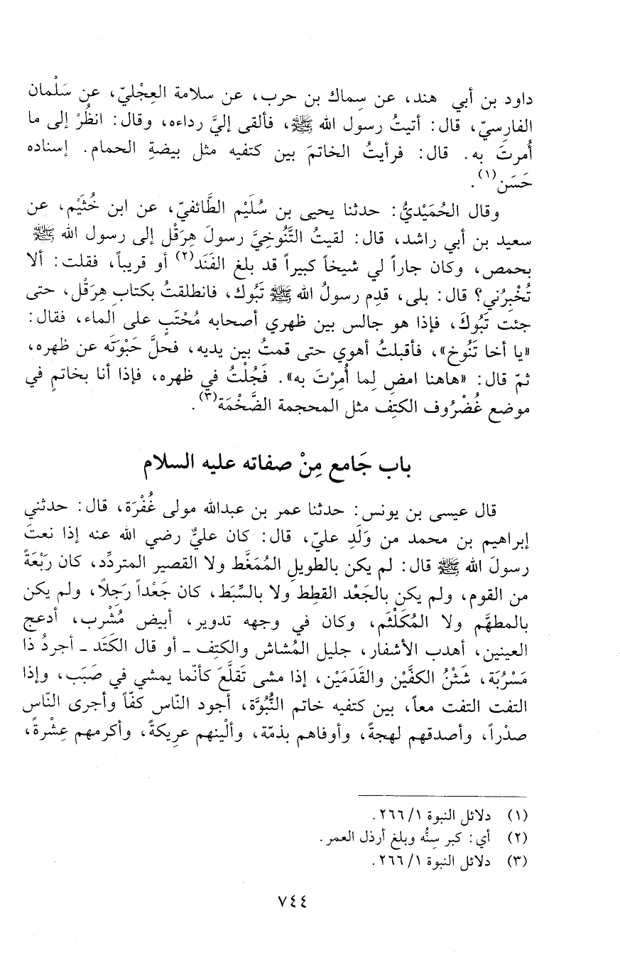 داود بن أبي هند، عن سماك بن حَرْبٍ، عَنْ سَلَامَةَ الْعِجْلِيِّ، عَنْ سَلْمَانَ الْفَارِسِيِّ قَالَ: أَتَيْتُ رَسُولَ اللَّهِ - صَلَّى اللَّهُ عَلَيْهِ وَسَلَّمَ -، فَأَلْقَى إِلَيَّ رِدَاءَهُ وَقَالَ: انْظُرْ إِلَى مَا أُمِرْتَ بِهِ، قَالَ: فَرَأَيْتُ الْخَاتَمَ بَيْنَ كَتِفَيْهِ مِثْلَ بَيْضَةِ الْحَمَامِ. إِسْنَادُهُ حَسَنٌ.
