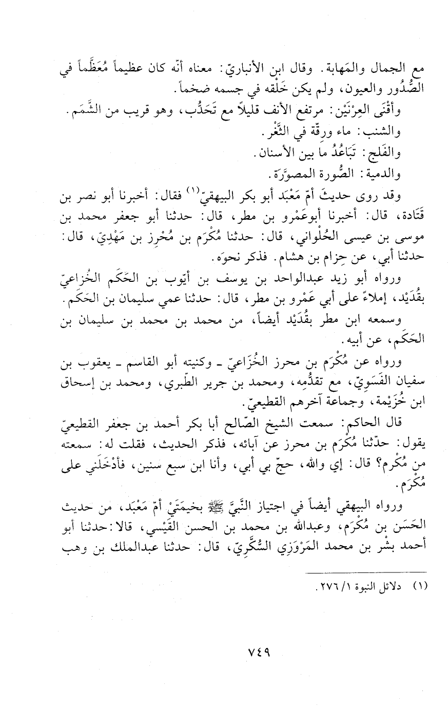 وَقَدْ رَوَى حَدِيثَ أُمِّ مَعْبَدٍ أبو بكر البيهقيّ فقال: أخبرنا أبو نصر بن قتادة، قال: أخبرنا أبو عمرو بن مطر، قال: حدثنا أَبُو جَعْفَرٍ مُحَمَّدُ بْنُ مُوسَى بْنِ عِيسَى الحلواني، قال: حدثنا مكرم بن محرز بن مهديّ، قال: حدثنا أَبِي، عَنْ حِزَامِ بْنِ هِشَامٍ. فَذَكَرَ نَحْوَهُ.