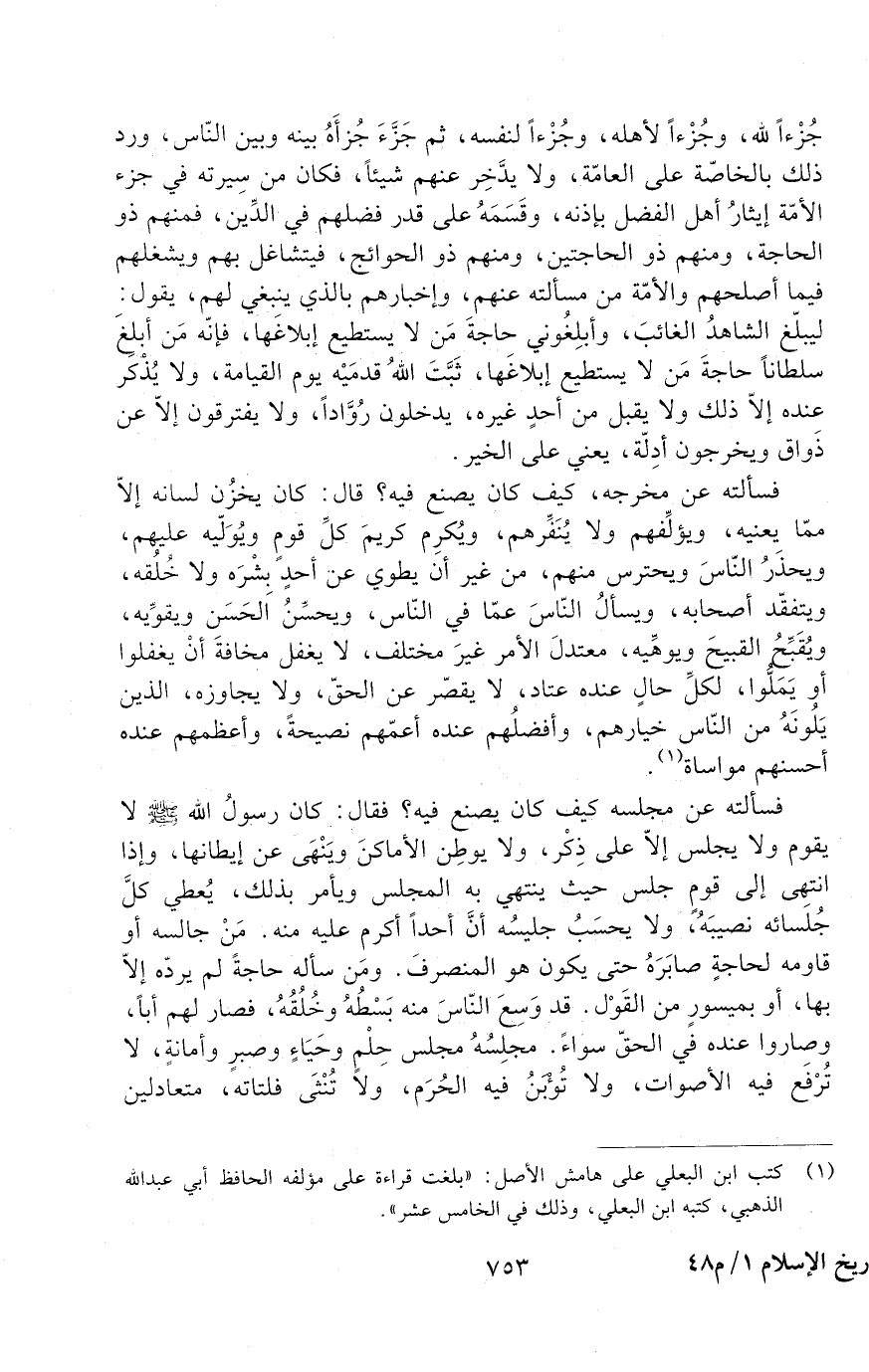 فَسَأَلْتُهُ عَنْ مَجْلِسِهِ كَيْفَ كَانَ يَصْنَعُ فِيهِ؟ فَقَالَ: كَانَ رَسُولُ اللَّهِ - صَلَّى اللَّهُ عَلَيْهِ وَسَلَّمَ - لَا يَقُومُ وَلَا يَجْلِسُ إِلَّا عَلَى ذِكْرٍ، وَلا يُوطِنُ الْأَمَاكِنَ وَيَنْهَى عَنْ إِيطَانِهَا، وَإِذَا انْتَهَى إِلَى قَوْمٍ جَلَسَ حَيْثُ يَنْتَهِي به المجلس ويأمر بذلك، يعطي كُلَّ جُلَسَائِهِ نَصِيبَهُ، وَلَا يَحْسِبُ جَلِيسُهُ أَنَّ أَحَدًا أَكْرَمَ عَلَيْهِ مِنْهُ، مَنْ جَالَسَهُ أَوْ قَاوَمَهُ لِحَاجَةٍ صَابَرَهُ حَتَّى يَكُونَ هُوَ الْمُنْصَرِفَ، وَمَنْ سَأَلَهُ حَاجَةً لَمْ يَرُدَّهُ إِلَّا بِهَا، أَوْ بِمَيْسُورٍ مِنَ الْقَوْلِ، قَدْ وَسِعَ النَّاسَ مِنْهُ بَسْطُهُ وَخُلُقُهُ، فَصَارَ لَهُمْ أَبًا، وَصَارُوا عِنْدَهُ فِي الْحَقِّ سَوَاءً، مَجْلِسُهُ مَجْلِسُ حِلْمٍ وَحَيَاءٍ وَصَبْرٍ وَأَمَانَةٍ، لَا تُرْفَعُ فِيهِ الْأَصْوَاتُ، وَلَا تُؤَبَّنُ فِيهِ الْحُرَمُ، وَلَا تُنْثَى فَلَتَاتُهُ، متعادلين