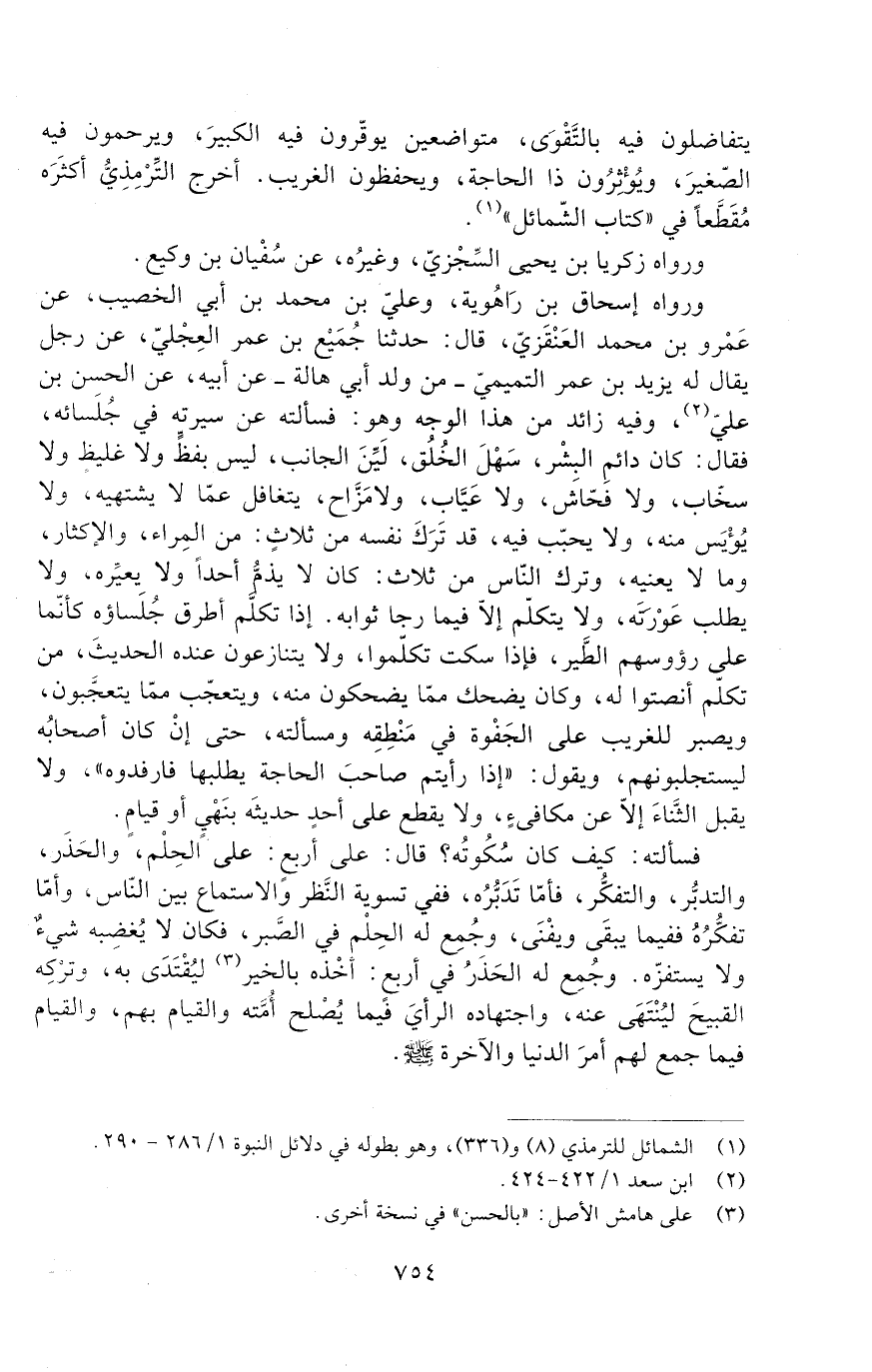 فَسَأَلْتُهُ: كَيْفَ كَانَ سُكُوتُهُ؟ قَالَ: عَلَى أَرْبَعٍ: عَلَى الْحِلْمِ، وَالْحَذَرِ، وَالتَّدَبُّرِ، وَالتَّفَكُّرِ، فَأَمَّا تَدَبُّرُهُ، فَفِي تَسْوِيَةِ النَّظَرِ وَالِاسْتِمَاعِ بَيْنَ النَّاسِ، وَأَمَّا تفكّره ففيما يبقى ويفنى، وجمع له الْحِلْمُ فِي الصَّبْرِ، فَكَانَ لَا يُغْضِبُهُ شَيْءٌ وَلَا يَسْتَفِزُّهُ. وَجُمِعَ لَهُ الْحَذَرُ فِي أَرْبَعٍ: أخذه بِالْخَيْرِ لِيُقْتَدَى بِهِ، وَتَرْكِهِ الْقَبِيحَ لِيُنْتَهَى عَنْهُ، وَاجْتِهَادِهِ الرَّأْيَ فِيمَا يُصْلِحُ أُمَّتَهُ وَالْقِيَامِ بِهِمْ، وَالْقِيَامِ فِيمَا جَمَعَ لَهُمْ أَمْرَ الدُّنْيَا وَالْآخِرَةِ - صَلَّى اللَّهُ عَلَيْهِ وَسَلَّمَ -.