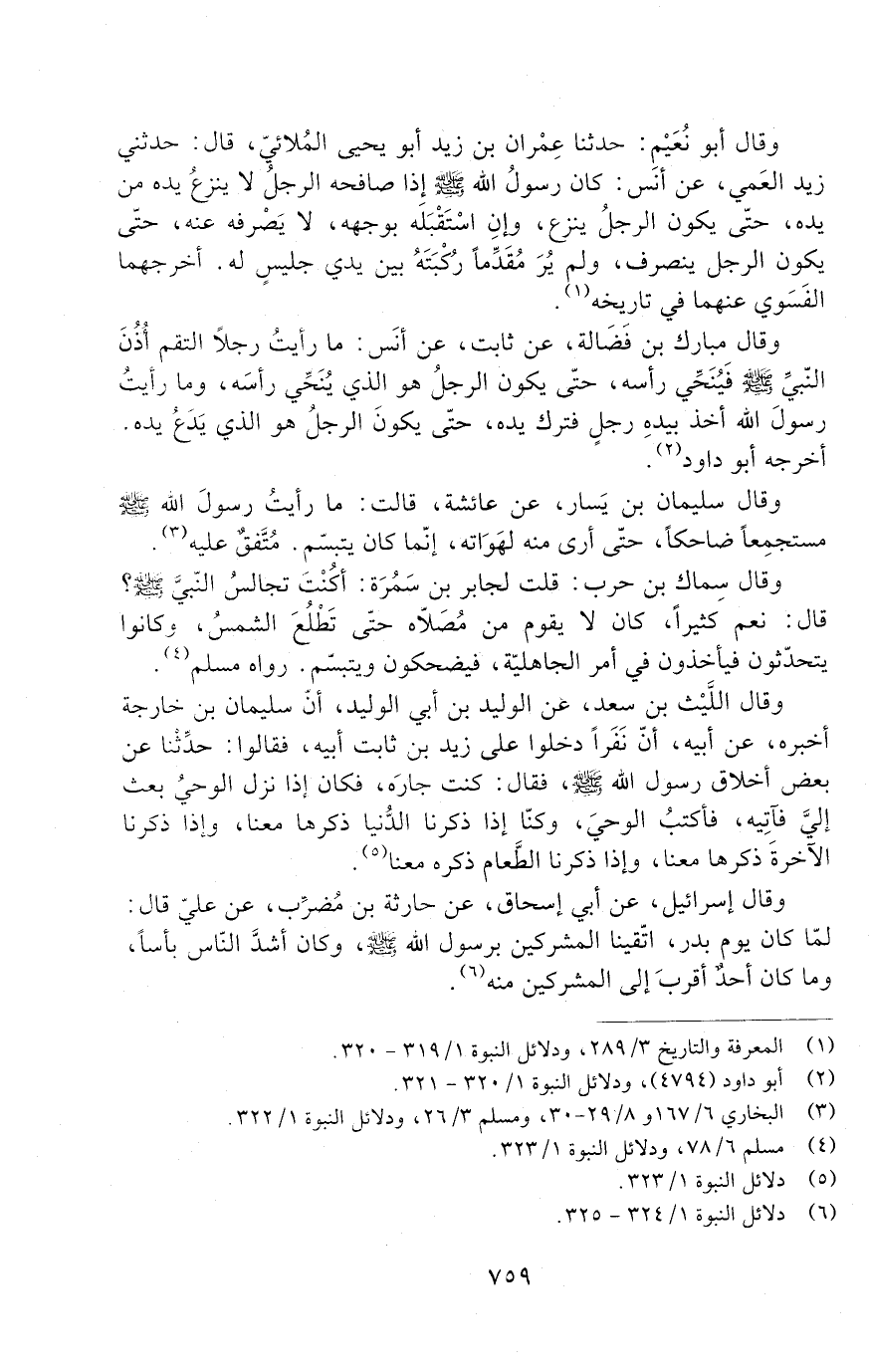 وقال أبو نعيم: حدثنا عمران بن زيد أبو يحيى الملائيّ، قال: حَدَّثَنِي زَيْدٌ الْعَمِيُّ، عَنْ أَنَسٍ: كَانَ رَسُولُ اللَّهِ - صَلَّى اللَّهُ عَلَيْهِ وَسَلَّمَ - إِذَا صَافَحَهُ الرَّجُلُ لَا يَنْزِعُ يَدَهُ مِنْ يَدِهِ، حَتَّى يَكُونَ الرَّجُلُ يَنْزِعُ، وَإِنِ اسْتَقْبَلَهُ بِوَجْهِهِ، لَا يَصْرِفُهُ عَنْهُ، حَتَّى يَكُونَ الرَّجُلُ يَنْصَرِفُ، وَلَمْ يُرَ مُقَدِّمًا رُكْبَتَهُ بَيْنَ يَدَيْ جَلِيسٍ لَهُ. أَخْرَجَهُمَا الْفَسَوِيُّ عَنْهُمَا فِي تَارِيخِهِ.
