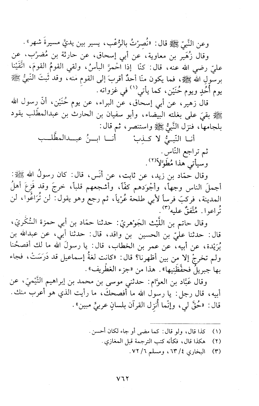 وقال زهير بن معاوية، عَنْ أَبِي إِسْحَاقَ، عَنْ حَارِثَةَ بْنِ مُضَرِّبٍ، عَنْ عَلِيٍّ - رَضِيَ اللَّهُ عَنْهُ - قَالَ: كُنَّا إِذَا احْمَرَّ الْبَأْسُ، وَلَقِيَ الْقَوْمُ الْقَوْمَ، اتَّقَيْنَا بِرَسُولِ اللَّهِ - صَلَّى اللَّهُ عَلَيْهِ وَسَلَّمَ - فَمَا يَكُونُ مِنَّا أَحَدٌ أَقْرَبَ إِلَى الْقَوْمِ مِنْهُ، وَقَدْ ثَبُتَ النَّبِيُّ - صَلَّى اللَّهُ عَلَيْهِ وَسَلَّمَ - يَوْمَ أُحُدٍ ويوم حنين، كما يأتي فِي غَزَوَاتِهِ.
