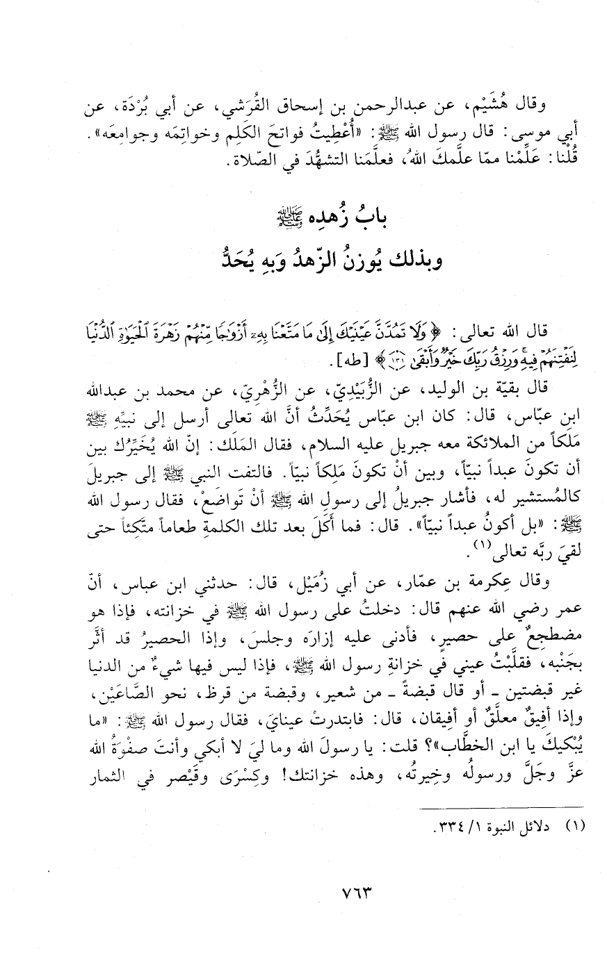 قَالَ بَقِيَّةُ بْنُ الْوَلِيدِ، عَنِ الزُّبَيْدِيِّ، عَنِ الزُّهْرِيِّ، عَنْ مُحَمَّدِ بْنِ عَبْدِ اللَّهِ بْنِ عَبَّاسٍ قَالَ: كَانَ ابْنُ عَبَّاسٍ يُحَدِّثُ أَنَّ اللَّهَ - تَعَالَى - أَرْسَلَ إِلَى نَبِيِّهِ - صَلَّى اللَّهُ عَلَيْهِ وَسَلَّمَ - مَلَكًا مِنَ الْمَلَائِكَةِ مَعَهُ جِبْرِيلُ - عليه السلام -، فَقَالَ الْمَلَكُ: إِنَّ اللَّهَ يُخَيِّرُكَ بَيْنَ أَنْ تَكُونَ عَبْدًا نَبِيًّا، وَبَيْنَ أَنْ تَكُونَ مَلَكًا نَبِيًّا، فَالْتَفَتَ النَّبِيُّ - صَلَّى اللَّهُ عَلَيْهِ وَسَلَّمَ - إِلَى جِبْرِيلَ كَالْمُسْتَشِيرِ لَهُ، فَأَشَارَ جِبْرِيلُ إِلَى رَسُولِ اللَّهِ - صَلَّى اللَّهُ عَلَيْهِ وَسَلَّمَ - أن تَوَاضَعْ، فَقَالَ رَسُولُ اللَّهِ - صَلَّى اللَّهُ عَلَيْهِ وَسَلَّمَ -: " بَلْ أَكُونَ عَبْدًا نَبِيًّا ". قَالَ: فَمَا أَكَلَ بَعْدَ تِلْكَ الْكَلِمَةِ طَعَامًا مُتَّكِئًا حَتَّى لَقِيَ رَبَّهُ - تَعَالَى -.