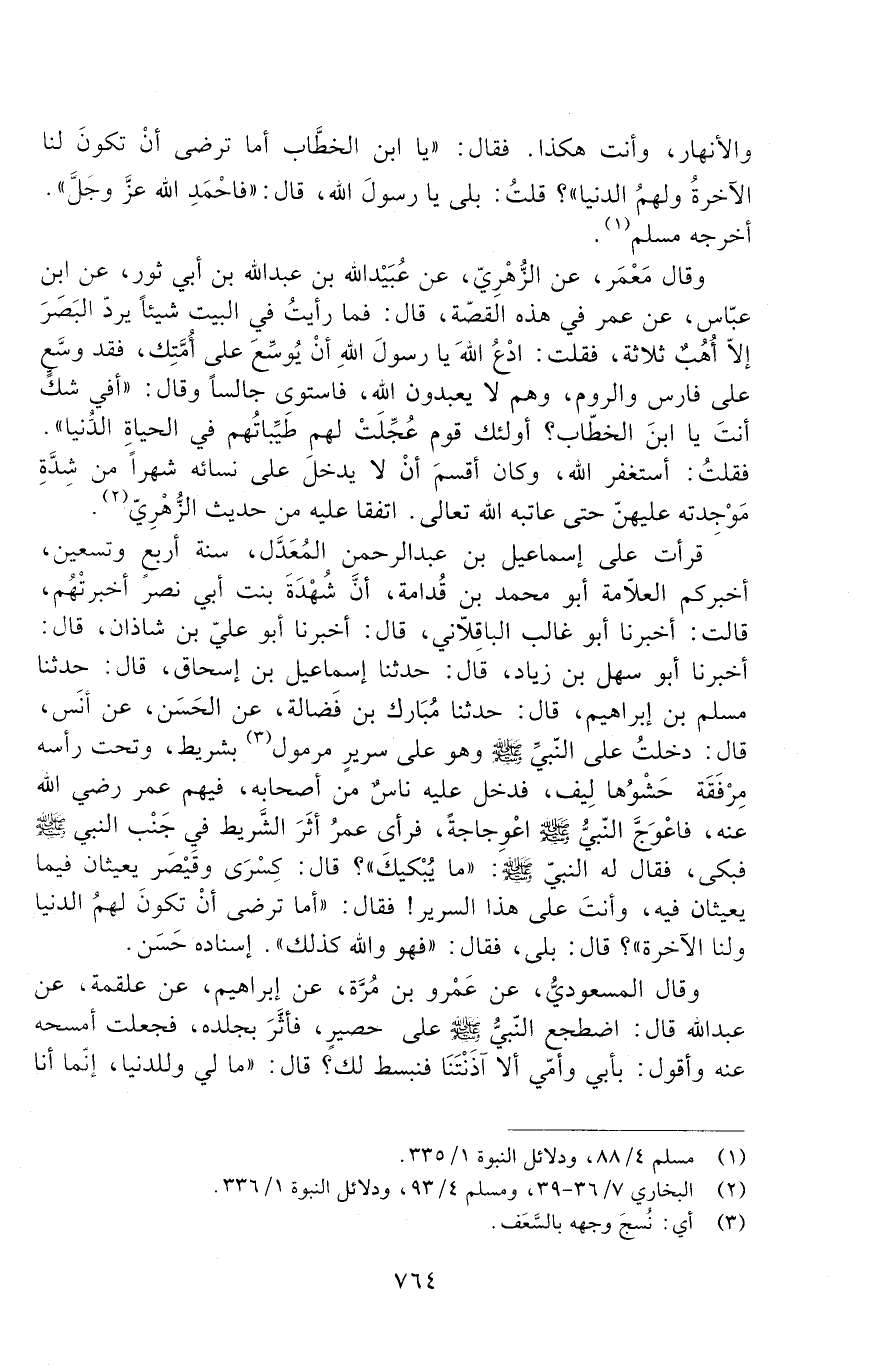 قَرَأْتُ عَلَى إِسْمَاعِيلَ بْنِ عَبْدِ الرَّحْمَنِ الْمُعَدَّلِ، سَنَةَ أَرْبَعٍ وَتِسْعِينَ، أَخْبَرَكُمُ الْعَلَّامَةُ أَبُو مُحَمَّدِ بْنِ قُدَامَةَ، أنّ شهدة بنت أبي نصر أخبرتهم، قالت: أخبرنا أبو غالب الباقلاّني، قال: أخبرنا أبو عليّ بن شاذان، قال: أخبرنا أبو سهل بن زياد، قال: حدثنا إسماعيل بن إسحاق، قال: حدثنا مسلم بن إبراهيم، قال: حدثنا مُبَارَكُ بْنُ فَضَالَةَ، عَنِ الْحَسَنِ، عَنْ أَنَسٍ قَالَ: دَخَلْتُ عَلَى النَّبِيِّ - صَلَّى اللَّهُ عَلَيْهِ وَسَلَّمَ - وَهُوَ عَلَى سَرِيرٍ مَرْمُولٍ بِشَرِيطٍ، وَتَحْتَ رَأْسِهِ مِرْفَقَةٌ حَشْوُهَا لِيفٌ، فَدَخَلَ عَلَيْهِ نَاسٌ مِنْ أَصْحَابِهِ، فِيهِمْ عُمَرُ - رَضِيَ اللَّهُ عَنْهُ - فَاعْوَجَّ النَّبِيُّ - صَلَّى اللَّهُ عَلَيْهِ وَسَلَّمَ - اعْوِجَاجَةً، فَرَأَى عُمَرُ أَثَرَ الشَّرِيطِ فِي جَنْبِ النَّبِيِّ - صَلَّى اللَّهُ عَلَيْهِ وَسَلَّمَ - فَبَكَى، فَقَالَ لَهُ النَّبِيُّ - صَلَّى اللَّهُ عَلَيْهِ وَسَلَّمَ -: " مَا يُبْكِيكَ "؟ قال: كِسْرَى وَقَيْصَرُ يَعِيثَانِ فِيمَا يَعِيثَانِ فِيهِ، وَأَنْتَ عَلَى هَذَا السَّرِيرِ! فَقَالَ: " أَمَا تَرْضَى أَنْ تَكُونَ لَهُمُ الدُّنْيَا وَلَنَا الْآخِرَةُ "؟ قَالَ: بَلَى، فَقَالَ: " فَهُوَ وَاللَّهِ كَذَلِكَ ". إِسْنَادُهُ حَسَنٌ.