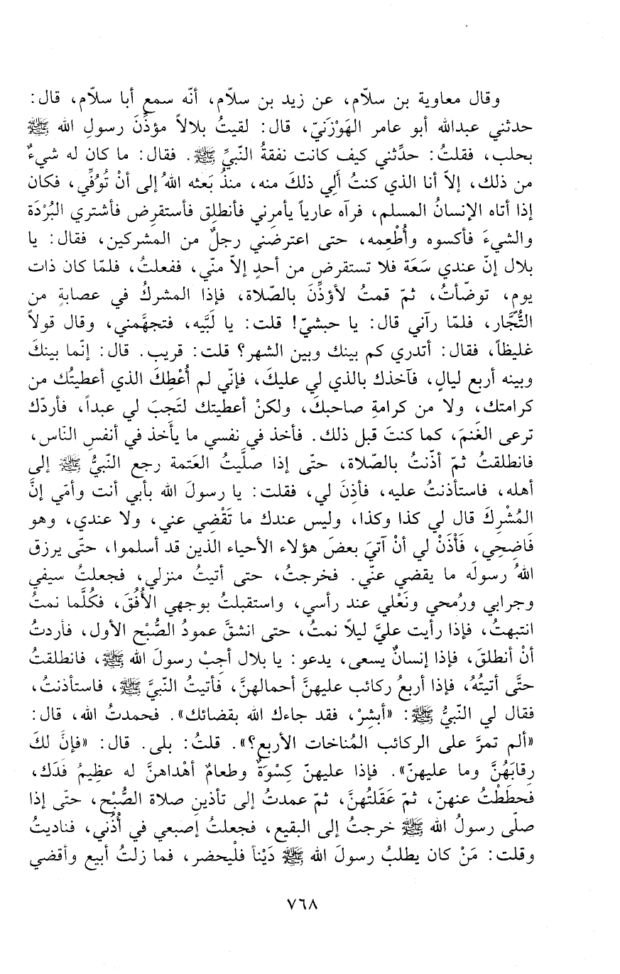 وقال معاوية بن سلام، عن زيد بن سلام، أنّه سمع أبا سلاّم، قال: حَدَّثَنِي عَبْدُ اللَّهِ أَبُو عَامِرٍ الْهَوْزَنِيُّ قَالَ: لَقِيتُ بِلَالًا مُؤَذِّنَ رَسُولِ اللَّهِ - صَلَّى اللَّهُ عَلَيْهِ وَسَلَّمَ - بِحَلَبٍ، فَقُلْتُ: حَدِّثْنِي كَيْفَ كَانَتْ نَفَقَةُ النَّبِيِّ - صَلَّى اللَّهُ عَلَيْهِ وَسَلَّمَ -، فَقَالَ: مَا كَانَ لَهُ شَيْءٌ مِنْ ذَلِكَ، إِلَّا أَنَا الَّذِي كُنْتُ أَلِي ذَلِكَ مِنْهُ، مُنْذُ بَعَثَهُ اللَّهُ إِلَى أَنْ تُوُفِّيَ، فَكَانَ إِذَا أَتَاهُ الْإِنْسَانُ الْمُسْلِمُ، فَرَآهُ عَارِيًا يَأْمُرُنِي فَأَنْطَلِقُ فَأَسْتَقْرِضُ فَأَشْتَرِي الْبُرْدَةَ وَالشَّيْءَ فَأَكْسُوهُ وَأُطْعِمُهُ، حَتَّى اعْتَرَضَنِي رَجُلٌ مِنَ الْمُشْرِكِينَ، فَقَالَ: يَا بِلَالُ إِنَّ عِنْدِي سَعَةً فَلَا تَسْتَقْرِضْ مِنْ أَحَدٍ إِلَّا مِنِّي، فَفَعَلْتُ، فَلَمَّا كَانَ ذَاتُ يَوْمٍ، تَوَضَّأْتُ، ثُمَّ قُمْتُ لِأُؤَذِّنَ بِالصَّلَاةِ، فَإِذَا الْمُشْرِكُ فِي عِصَابَةٍ مِنَ التُّجَّارِ، فَلَمَّا رَآنِي قَالَ: يَا حَبَشِيُّ، قُلْتُ: يَا لَبَّيْهِ، فَتَجَهَّمَنِي، وَقَالَ قَوْلًا غَلِيظًا، فَقَالَ: أَتَدْرِي كَمْ بَيْنَكَ وَبَيْنَ الشَّهْرِ؟ قُلْتُ: قَرِيبٌ. قَالَ: إِنَّمَا بَيْنَكَ وَبَيْنَهُ أَرْبَعُ لَيَالٍ، فَآخُذُكَ بِالَّذِي لِي عَلَيْكَ، فَإِنِّي لَمْ أُعْطِكَ الَّذِي أَعْطَيْتُكَ مِنْ كَرَامَتِكَ، وَلَا من كرامة صاحبك، ولكن أعطيتك لتجب لِي عَبْدًا، فَأَرُدَّكَ تَرْعَى الْغَنَمَ، كَمَا كُنْتَ قبل ذلك، فأخذ فِي نَفْسِي مَا يَأْخُذُ فِي أَنْفُسِ النَّاسِ، فَانْطَلَقْتُ ثُمَّ أَذَّنْتُ بِالصَّلَاةِ، حَتَّى إِذَا صَلَّيْتُ الْعَتْمَةَ رَجَعَ النَّبِيُّ - صَلَّى اللَّهُ عَلَيْهِ وَسَلَّمَ - إِلَى أَهْلِهِ، فَاسْتَأْذَنْتُ عَلَيْهِ، فَأَذِنَ لِي، فَقُلْتُ: يَا رَسُولَ اللَّهِ بِأَبِي أَنْتَ وَأُمِّي إِنَّ الْمُشْرِكَ قَالَ لِي كَذَا وَكَذَا، وَلَيْسَ عِنْدَكَ مَا تَقْضِي عَنِّي، وَلَا عِنْدِي، وَهُوَ فَاضِحِي، فَأْذَنْ لِي أَنْ آتِيَ بَعْضَ هَؤُلَاءِ الْأَحْيَاءِ الَّذِينَ قَدْ أَسْلَمُوا، حَتَّى يَرْزُقَ اللَّهُ رَسُولَهُ مَا يَقْضِي عَنِّي، فَخَرَجْتُ، حَتَّى أَتَيْتُ مَنْزِلِي، فَجَعَلْتُ سَيْفِي وَجِرَابِي وَرُمْحِي وَنَعْلِي عِنْدَ رَأْسِي، وَاسْتَقْبَلْتُ بِوَجْهِي الْأُفُقَ، فَكُلَّمَا نِمْتُ انْتَبَهْتُ، فَإِذَا رَأَيْتُ عَلَيَّ لَيْلًا نِمْتُ، حَتَّى انْشَقَّ عَمُودُ الصُّبْحِ الْأَوَّلِ، فَأَرَدْتُ أَنْ أَنْطَلِقَ، فَإِذَا إِنْسَانٌ يَسْعَى، يَدْعُو: يَا بِلَالُ أَجِبْ رَسُولَ اللَّهِ - صَلَّى اللَّهُ عَلَيْهِ وَسَلَّمَ - فَانْطَلَقْتُ حَتَّى أَتَيْتُهُ، فَإِذَا أَرْبَعُ رَكَائِبَ عَلَيْهِنَّ أَحْمَالُهُنَّ، فَأَتَيْتُ النَّبِيَّ - صَلَّى اللَّهُ عَلَيْهِ وَسَلَّمَ -، فَاسْتَأْذَنْتُ، فَقَالَ لِي النَّبِيُّ - صَلَّى اللَّهُ عَلَيْهِ وَسَلَّمَ -: " أَبْشِرْ، فَقَدْ جَاءَكَ اللَّهُ بِقَضَائِكَ "، فَحَمِدْتُ اللَّهَ، قَالَ: " أَلَمْ تَمُرَّ عَلَى الرَّكَائِبِ الْمُنَاخَاتِ الْأَرْبَعِ "؟ قُلْتُ: بَلَى، قَالَ: " فَإِنَّ لَكَ رِقَابَهُنَّ وَمَا عَلَيْهِنَّ "، فَإِذَا عَلَيْهِنَّ كِسْوَةٌ وَطَعَامٌ أَهْدَاهُنَّ لَهُ عَظِيمُ فَدَكٍ، فَحَطَطْتُ عَنْهُنَّ، ثُمَّ عَقَلْتُهُنَّ، ثُمَّ عَمَدْتُ إِلَى تَأْذِينِ صَلَاةِ الصُّبْحِ، حَتَّى إِذَا صَلَّى رَسُولُ اللَّهِ - صَلَّى اللَّهُ عَلَيْهِ وَسَلَّمَ - خَرَجْتُ إِلَى البقيع، فجعلت إصبعي في أذني، فناديت وَقُلْتُ: مَنْ كَانَ يَطْلُبُ رَسُولَ اللَّهِ - صَلَّى اللَّهُ عَلَيْهِ وَسَلَّمَ - دَيْنًا فَلْيَحْضُرْ، فَمَا زِلْتُ أبيع وأقضي