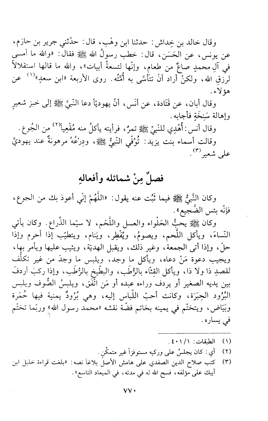 وكان - صلى الله عليه وسلم - يحبّ الحلواء والعسل واللّحم، لا سِيَّمَا الذِّرَاعَ. وَكَانَ يَأْتِي النِّسَاءَ، وَيَأْكُلُ اللَّحْمَ، وَيَصُومُ، وَيُفْطِرُ، وَيَنَامُ، وَيَتَطَيَّبُ إِذَا أَحْرَمَ وَإِذَا حَلَّ، وَإِذَا أَتَى الْجُمُعَةَ، وَغَيْرَ ذَلِكَ، وَيَقْبَلُ الهديّة، ويثيب عَلَيْهَا وَيَأْمُرُ بِهَا، وَيُجِيبُ دَعْوَةَ مَنْ دَعَاهُ، وَيَأْكُلُ مَا وَجَدَ، وَيَلْبَسُ مَا وَجَدَ مِنْ غَيْرِ تَكَلُّفٍ لِقَصْدِ ذَا وَلَا ذَا، وَيَأْكُلُ الْقِثَّاءَ بِالرُّطَبِ، وَالْبِطِّيخَ بِالرُّطَبِ، وَإِذَا رَكِبَ أَرْدَفَ بَيْنَ يَدَيْهِ الصَّغِيرَ أَوْ يُرْدِفُ وَرَاءَهُ عَبْدَهُ أَوْ مَنِ اتَّفَقَ، وَيَلْبَسُ الصُّوفَ وَيَلْبَسُ الْبُرُودَ الحبرة، وكانت أَحَبَّ اللِّبَاسِ إِلَيْهِ، وَهِيَ بُرُودٌ يَمَنِيَّةٌ فِيهَا حُمْرَةٌ وَبَيَاضٌ، وَيَتَخَتَّمُ فِي يَمِينِهِ بِخَاتَمِ فِضَّةٍ نقشه " محمد رسول الله " وَرُبَّمَا تَخَتَّمَ فِي يَسَارِهِ.
