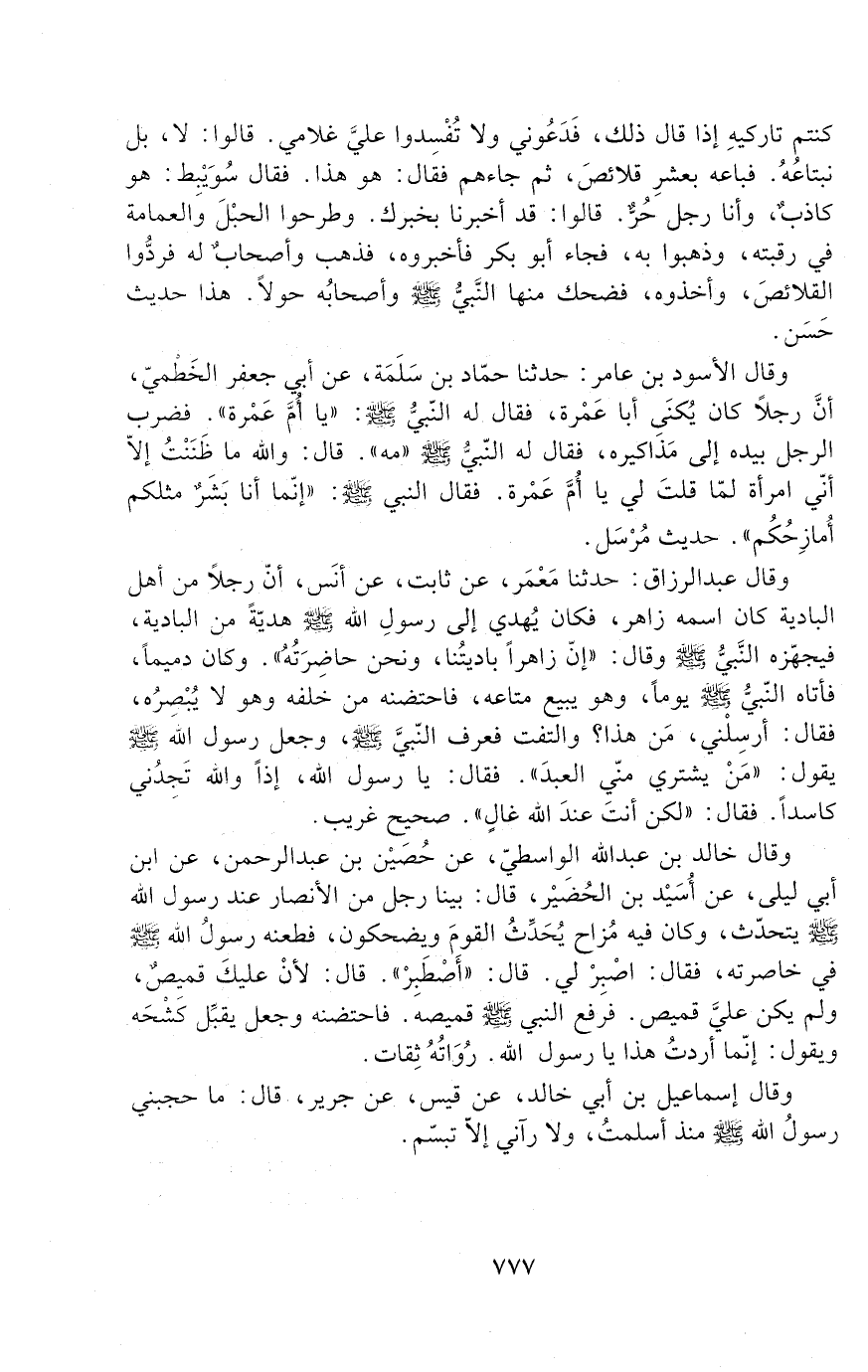 كُنْتُمْ تَارِكِيهِ إِذَا قَالَ ذَلِكَ، فَدَعُونِي وَلَا تُفْسِدُوا عَلَيَّ غُلَامِي، قَالُوا: لَا، بَلْ نَبْتَاعُهُ. فَبَاعَهُ بِعَشْرِ قَلَائِصَ، ثُمَّ جَاءَهُمْ فَقَالَ: هُوَ هَذَا، فَقَالَ سُوَيْبِطُ: هُوَ كَاذِبٌ، وَأَنَا رَجُلٌ حُرٌّ، قَالُوا: قَدْ أُخْبِرْنَا بِخَبَرِكَ. وَطَرَحُوا الْحَبْلَ وَالْعِمَامَةَ فِي رَقَبَتِهِ، وَذَهَبُوا بِهِ، فَجَاءَ أَبُو بَكْرٍ فَأَخْبَرُوهُ، فَذَهَبَ وَأَصْحَابٌ لَهُ فَرَدُّوا الْقَلائِصَ، وأخذوه، فضحك منها النّبيّ - صلى الله عليه وسلم - وأصحابه حولا. هَذَا حَدِيثٌ حَسَنٌ.