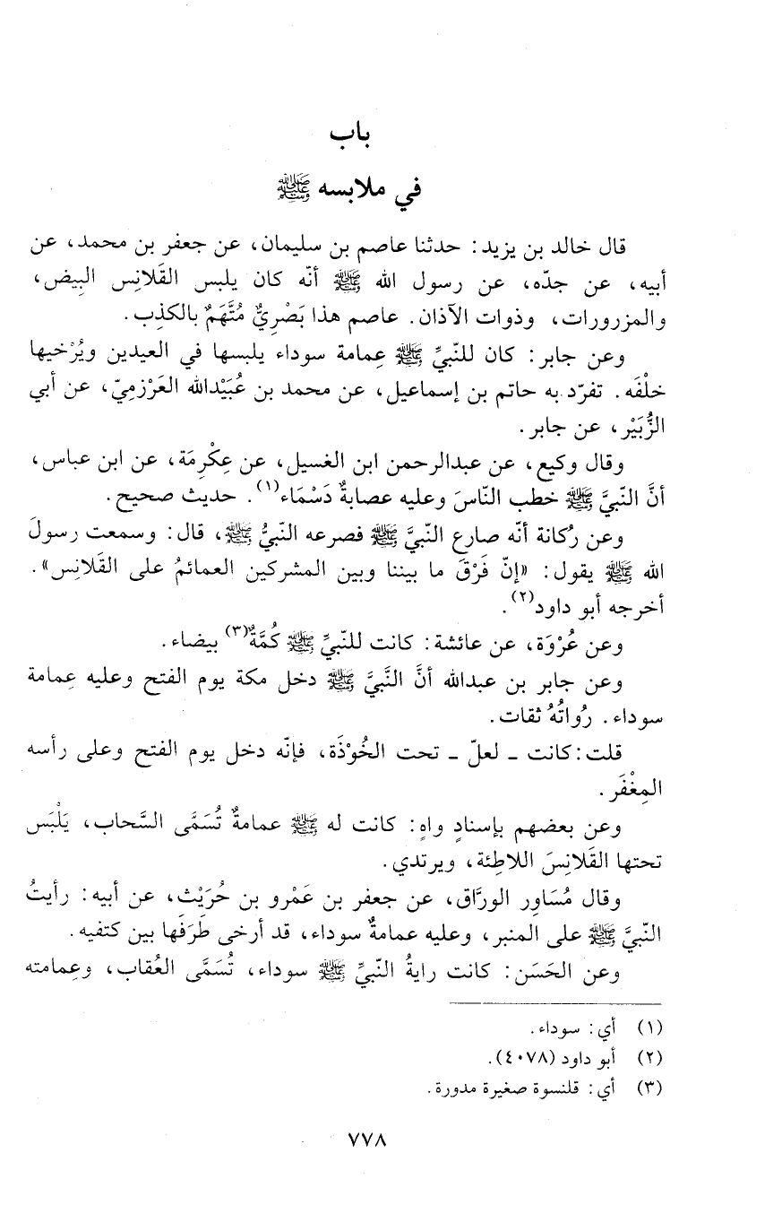 قال خالد بن يزيد: حدثنا عَاصِمُ بْنُ سُلَيْمَانَ، عَنْ جَعْفَرِ بْنِ مُحَمَّدٍ، عَنْ أَبِيهِ، عَنْ جَدِّهِ، عَنْ رَسُولِ اللَّهِ - صَلَّى اللَّهُ عَلَيْهِ وَسَلَّمَ - أَنَّهُ كَانَ يَلْبَسُ الْقَلَانِسَ الْبِيضَ وَالْمُزَرْوَرَاتِ، وَذَوَاتِ الْآذَانِ. عَاصِمٌ هَذَا بَصْرِيُّ مُتَّهَمٌ بِالْكَذِبِ.