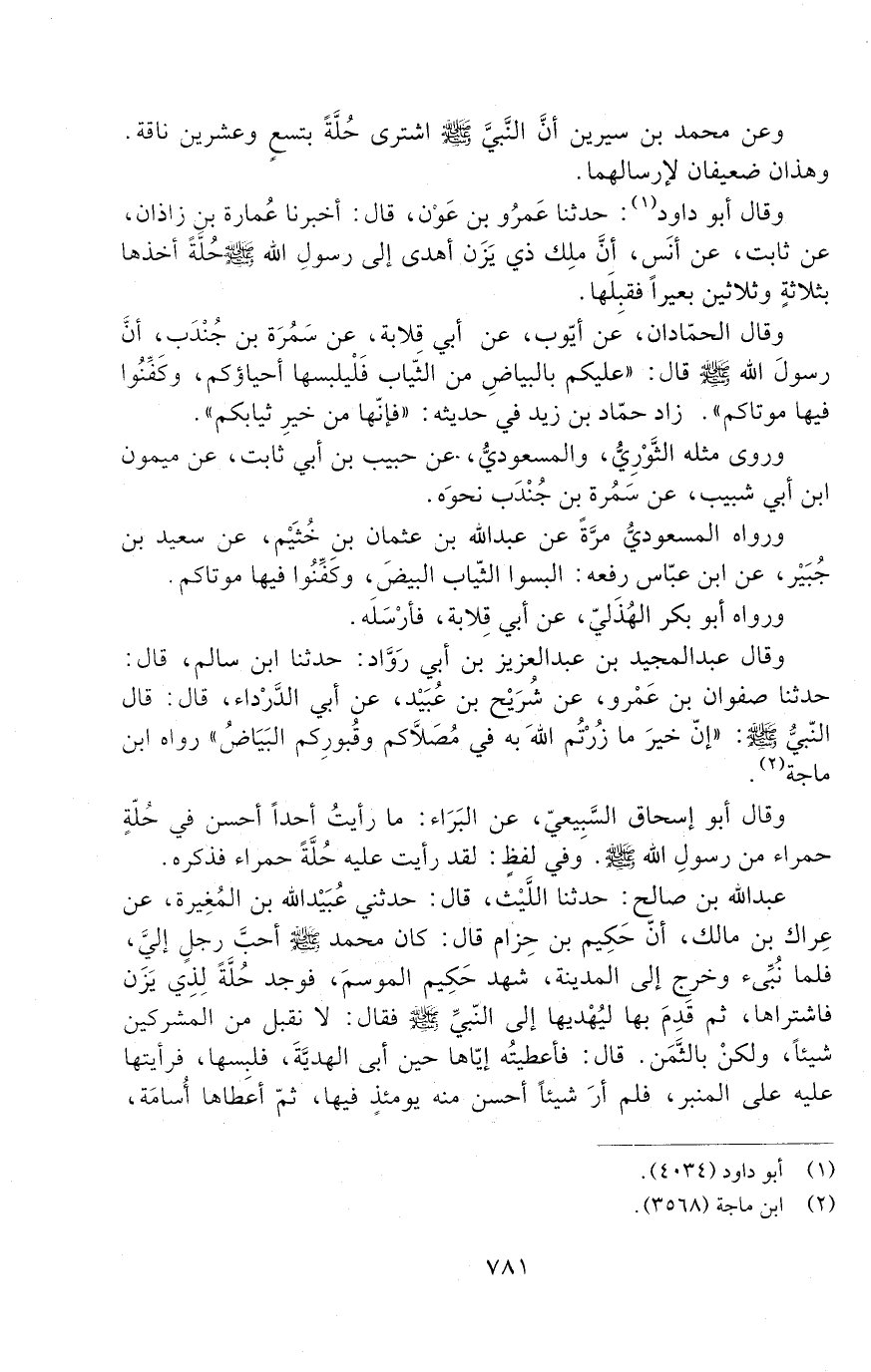 وَعَنْ مُحَمَّدِ بْنِ سِيرِينَ أَنَّ النَّبِيَّ صَلَّى اللَّهُ عَلَيْهِ وَسَلَّمَ اشْتَرَى حُلَّةً بِتِسْعٍ وَعِشْرِينَ ناقة.