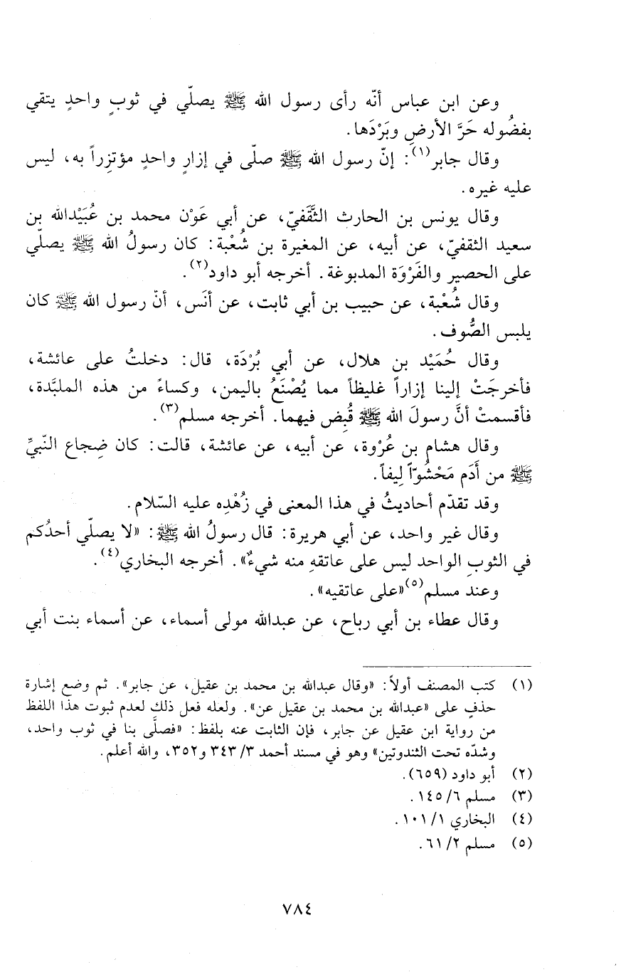 وعن ابن عباس أَنَّهُ رَأَى رَسُولَ اللَّهِ صَلَّى اللَّهُ عَلَيْهِ وَسَلَّمَ يُصَلِّي فِي ثَوْبٍ وَاحِدٍ يَتَّقِي بِفَضُولِهِ حَرَّ الأَرْضِ وبردها.