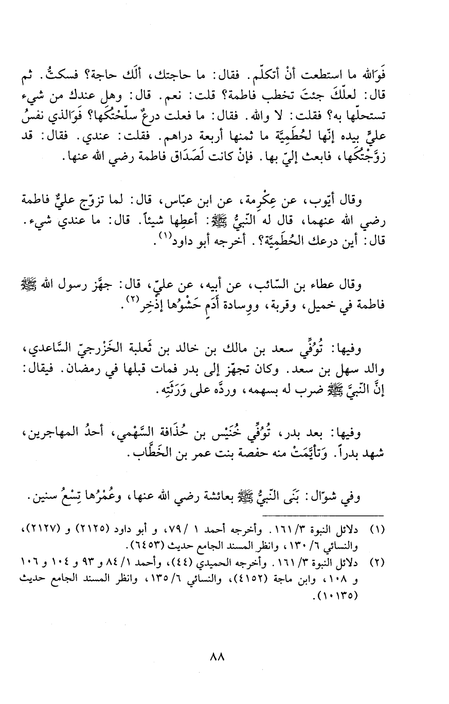 فَوَاللَّهِ مَا اسْتَطَعْتُ أَنْ أَتَكَلَّمَ. فَقَالَ: مَا حاجتك، أَلَكَ حَاجَةٌ؟ فَسَكَتُّ. ثُمَّ قَالَ: لَعَلَّكَ جِئْتَ تَخْطُبُ فَاطِمَةَ؟ قُلْتُ: نَعَمْ. قَالَ: وَهَلْ عِنْدَكَ مِنْ شَيْءٍ تَسْتَحِلُّهَا بِهِ؟ فَقُلْتُ: لَا وَاللَّهِ. فَقَالَ: مَا فَعَلَتْ دِرْعٌ سَلَّحْتُكَهَا؟ فَوَالَّذِي نَفْسُ عَلِيٍّ بِيَدِهِ إِنَّهَا لَحُطَمِيَّةٌ مَا ثَمَنُهَا أَرْبَعَةُ دراهم. فقلت: عندي. فقال: قد زوجتكها، فابعث إلي بها. فإن كَانَتْ لِصَدَاقِ فَاطِمَةَ رَضِيَ اللَّهُ عَنْهَا.