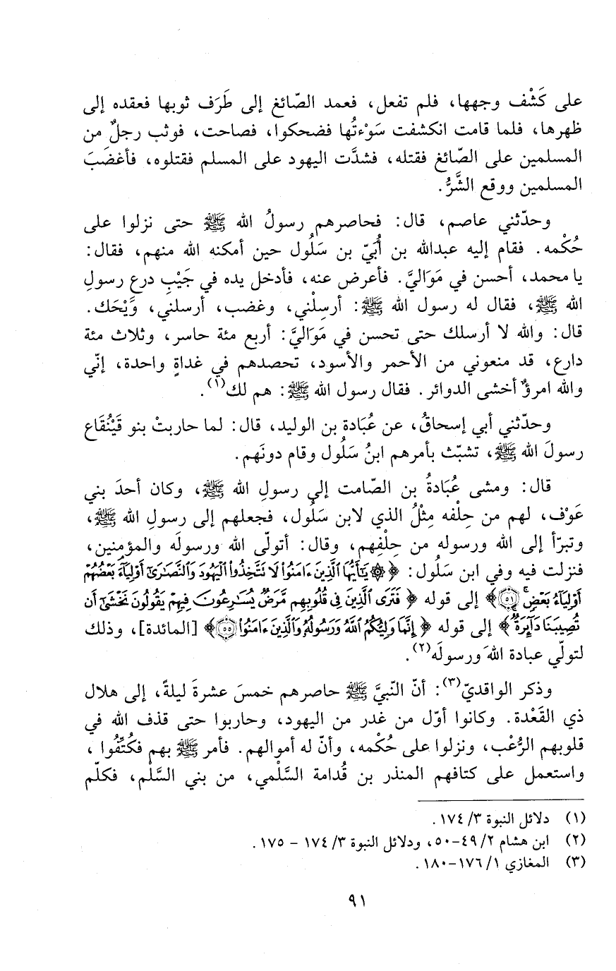 قَالَ: وَمَشَى عُبَادَةُ بْنُ الصَّامِتِ إِلَى رَسُولِ اللَّهِ صَلَّى اللَّهُ عَلَيْهِ وَسَلَّمَ؛ وَكَانَ أَحَدَ بَنِي عَوْفٍ؛ لَهُمْ مِنْ حِلْفِهِ مِثْلُ الَّذِي لِابْنِ سلول، فجعلهم إِلَى رَسُولِ اللَّهِ - صَلَّى اللَّهُ عَلَيْهِ وَسَلَّمَ -، وَتَبَرَّأَ إِلَى اللَّهِ وَرَسُولِهِ مِنْ حِلْفِهِمْ، وَقَالَ: أَتَوَلَّى اللَّهَ وَرَسُولَهُ وَالْمُؤْمِنِينَ، فَنَزَلَتْ فِيهِ وَفِي ابن سلول: " يا أيها الَّذِينَ آمَنُوا لا تَتَّخِذُوا الْيَهُودَ وَالنَّصَارَى أَوْلِيَاءَ بَعْضُهُمْ أَوْلِيَاءُ بَعْضٍ " إِلَى قَوْلِهِ: " فَتَرَى الَّذِينَ فِي قُلُوبِهِمْ مَرَضٌ يُسَارِعُونَ فِيهِمْ يَقُولُونَ نَخْشَى أَنْ تُصِيبَنَا دَائِرَةٌ " إِلَى قَوْلِهِ " إِنَّمَا وَلِيُّكُمُ اللَّهُ وَرَسُولُهُ وَالَّذِينَ آمنوا "؛ وذلك لَتَولَّى عُبَادَةُ اللَّهَ وَرَسُولَهُ.