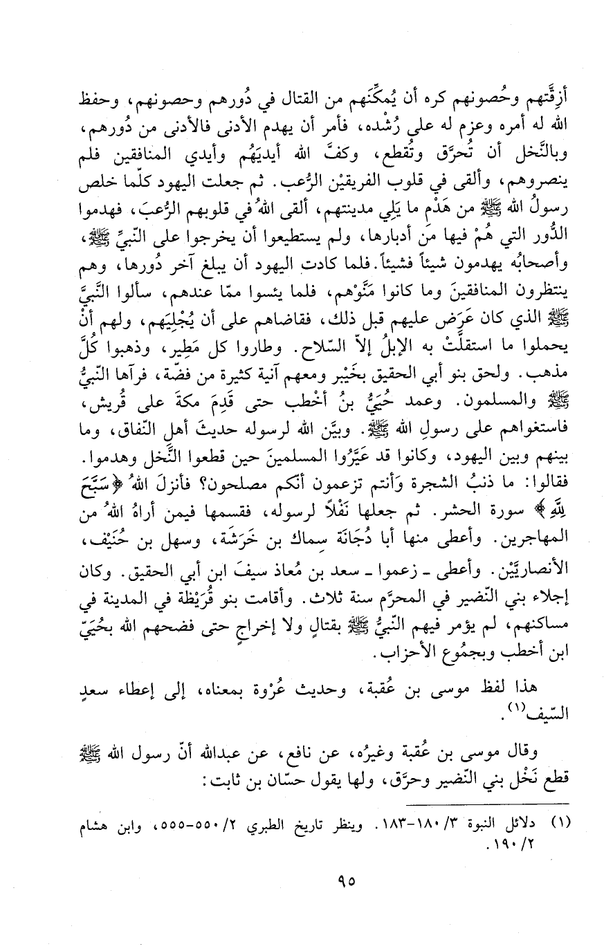 أَزِقَّتِهِمْ وَحُصُونِهِمْ كَرِهَ أَنْ يُمَكِّنَهُمْ مِنَ الْقِتَالِ فِي دُورِهِمْ وَحُصُونِهِمْ، وَحَفِظَ اللَّهُ لَهُ أَمْرَهُ وَعَزَمَ لَهُ عَلَى رُشْدِهِ، فَأَمَرَ أَنْ يُهْدَمَ الْأَدْنَى فَالْأَدْنَى مِنْ دُورِهِمْ، وَبِالنَّخْلِ أَنْ تُحَرَّقَ وَتُقَطَّعَ، وَكَفَّ اللَّهُ أَيْدِيَهُمْ وَأَيْدِي الْمُنَافِقِينَ فَلَمْ يَنْصُرُوهُمْ، وَأَلْقَى فِي قُلُوبِ الْفَرِيقَيْنِ الرُّعْبَ. ثُمَّ جَعَلَتِ الْيَهُودُ كُلَّمَا خَلُصَ رَسُولُ اللَّهِ - صَلَّى اللَّهُ عَلَيْهِ وَسَلَّمَ - مِنْ هَدْمِ مَا يَلِي مَدِينَتَهُمْ، أَلْقَى اللَّهُ فِي قُلُوبِهِمُ الرُّعْبَ، فَهَدَمُوا الدُّورَ الَّتِي هُمْ فِيهَا مِنْ أَدْبَارِهَا، وَلَمْ يَسْتَطِيعُوا أَنْ يَخْرُجُوا عَلَى النَّبِيِّ - صَلَّى اللَّهُ عَلَيْهِ وَسَلَّمَ -، وَأَصْحَابُهُ يَهْدِمُونَ شَيْئًا فَشَيْئًا. فَلَمَّا كَادَتِ الْيَهُودُ أَنْ تَبْلُغَ آخِرَ دُورِهَا، وَهُمْ يَنْتَظِرُونَ الْمُنَافِقِينَ وَمَا كَانُوا مَنَّوْهُمْ، فَلَمَّا يَئِسُوا مِمَّا عِنْدَهُمْ، سَأَلُوا النَّبِيَّ - صَلَّى اللَّهُ عَلَيْهِ وَسَلَّمَ - الَّذِي كَانَ عَرَضَ عَلَيْهِمْ قَبْلَ ذَلِكَ، فَقَاضَاهُمْ عَلَى أَنْ يُجْلِيَهُمْ، وَلَهُمْ أَنْ يَحْمِلُوا مَا اسْتَقَلَّتْ بِهِ الْإِبِلُ إِلَّا السِّلَاحَ. وَطَارُوا كُلَّ مُطَيَّرٍ، وَذَهَبُوا كُلَّ مَذْهَبٍ. وَلَحِقَ بَنُو أَبِي الْحَقِيقِ بِخَيْبَرَ وَمَعَهُمْ آنِيَةً كَثِيرَةً مِنْ فِضَّةٍ، فَرَآهَا النَّبِيُّ - صَلَّى اللَّهُ عَلَيْهِ وَسَلَّمَ - وَالْمُسْلِمُونَ. وَعَمَدَ حُيَيُّ بْنُ أَخْطَبَ حَتَّى قَدِمَ مَكَّةَ عَلَى قُرَيْشٍ، فَاسْتَغْوَاهُمْ عَلَى رَسُولِ اللَّهِ - صَلَّى اللَّهُ عَلَيْهِ وَسَلَّمَ -. وَبَيَّنَ اللَّهُ لِرَسُولِهِ حَدِيثَ أَهْلِ النِّفَاقِ، وَمَا بَيْنَهُمْ وَبَيْنَ الْيَهُودِ، وَكَانُوا قَدْ عَيَّرُوا الْمُسْلِمِينَ حِينَ قَطَعُوا النَّخْلَ وَهَدَمُوا. فَقَالُوا: مَا ذَنْبُ الشَّجَرَةِ وَأَنْتُمْ تَزْعُمُونَ أَنَّكُمْ مُصْلِحُونَ؟ فَأَنْزَلَ اللَّهُ " سَبَّحَ لِلَّهِ ". ثُمَّ جَعَلَهَا نَفْلًا لِرَسُولِهِ، فَقَسَّمَهَا فِيمَنْ أَرَاهُ اللَّهُ مِنَ الْمُهَاجِرِينَ. وَأَعْطَى مِنْهَا أَبَا دُجَانَةَ سِمَاكَ بْنَ خَرَشَةَ، وَسَهْلَ بْنَ حُنَيْفٍ، الْأَنْصَارِيَّيْنِ. وَأَعْطَى - زَعَمُوا - سَعْدَ بْنَ مُعَاذٍ سَيْفَ ابْنِ أَبِي الْحَقِيقِ.