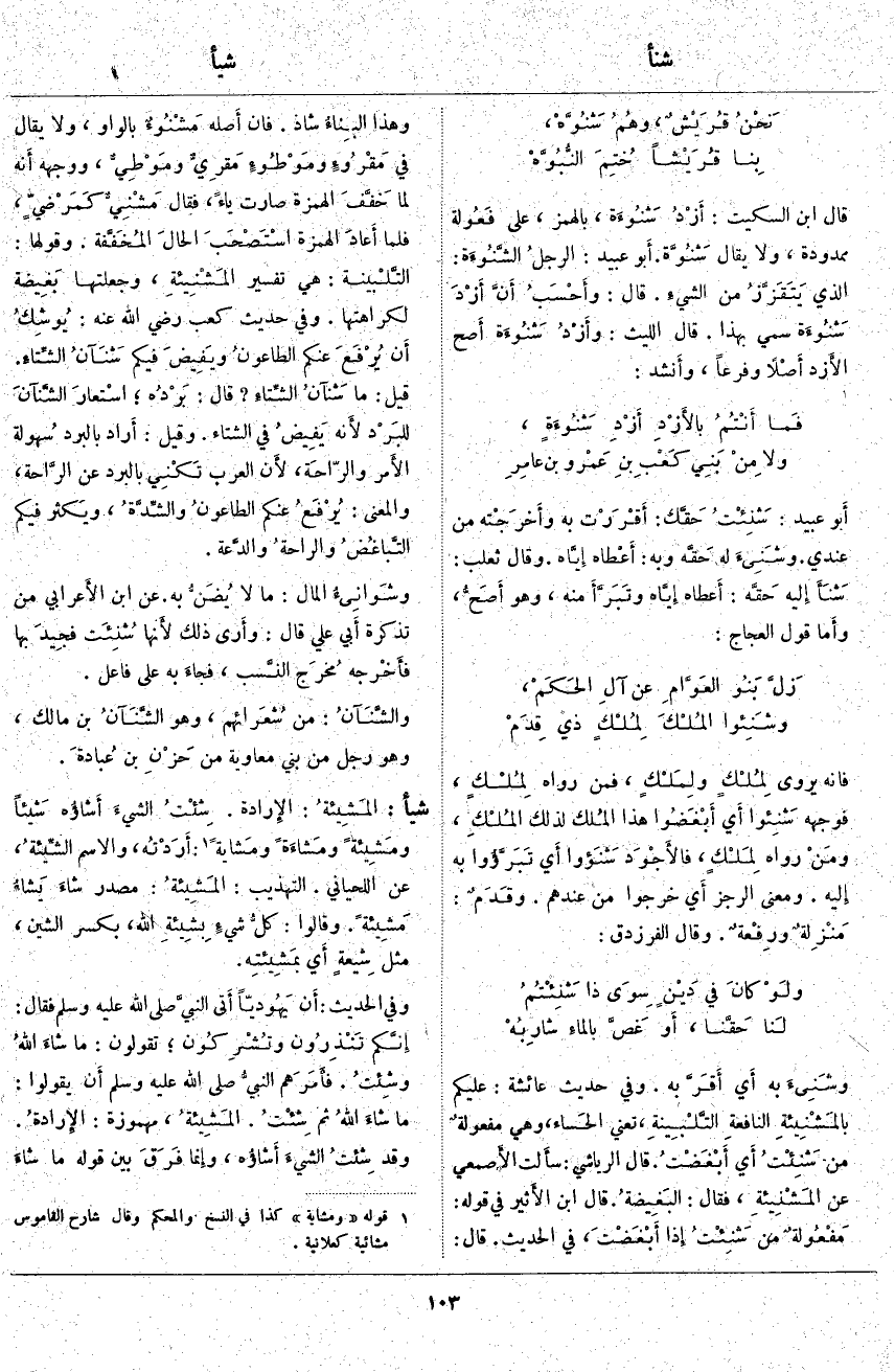 ، تَعْنِي الحَساء، وَهِيَ مفعولةٌ مِنْ شَنِئْتُ أَي أَبْغَضْتُ. قَالَ الرِّيَاشِيُّ: سَأَلْتُ الأَصمعي عَنِ المَشْنِيئةِ، فَقَالَ: البَغِيضةُ. قَالَ ابْنُ الأَثير فِي قَوْلِهِ: مَفْعُولةٌ مِنْ شَنِئْتُ إِذَا أَبْغَضْتَ، فِي الْحَدِيثِ. قَالَ: وَهَذَا البِناءُ شَاذٌّ. فَإِنَّ أَصله مَشْنُوءٌ بِالْوَاوِ، وَلَا يُقَالُ فِي مَقْرُوءٍ ومَوْطُوءٍ مَقرِيٌّ ومَوْطِيٌّ وَوَجْهُهُ أَنه لَمَّا خَفَّفَ الْهَمْزَةَ صَارَتْ يَاءً، فَقَالَ مَشْنِيٌّ كَمَرْضيٍّ، فَلَمَّا أَعادَ الْهَمْزَةَ اسْتَصْحَبَ الحالَ المُخَفّفة. وَقَوْلُهَا التَّلْبينة: هِيَ تَفْسِيرُ المَشْنِيئةِ، وَجَعَلَتْهَا بَغِيضة لِكَرَاهَتِهَا. وَفِي حَدِيثِ