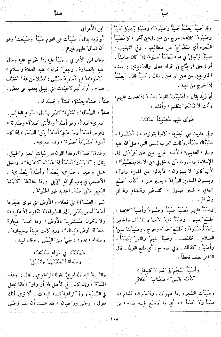 وَقَدْ صَبَأَ يَصْبَأُ صَبْأً وصُبُوءًا، وصَبُؤَ يَصْبُؤُ صَبْأً وصُبُوءًا كِلَاهُمَا: خَرَجَ مِنْ دِينٍ إِلَى دِينٍ آخَرَ، كَمَا تَصْبَأُ النُّجوم أَي تَخْرُجُ مِنْ مَطالِعها. وَفِي التَّهْذِيبِ: صَبَأَ الرَّجُلُ فِي دِينِهِ يَصْبَأُ صُبُوءًا إِذَا كَانَ صابِئاً. أَبو إِسحاق الزجَّاج فِي قَوْلِهِ تَعَالَى وَالصَّابِئِينَ*