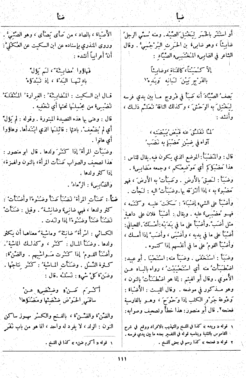 قَالَ: والمَضْبَأُ: الْمَوْضِعِ الَّذِي يَكُونُ فِيهِ. يُقَالُ لِلنَّاسِ: هَذَا مَضْبَؤُكم أَي مَوْضِعُكم، وَجَمْعُهُ مَضابِئُ. وضَبَأَ: لَصِقَ بالأَرضِ. وضَبَأْتُ بِهِ الأَرضَ، فَهُوَ مَضْبوءٌ بِهِ، إِذا أَلْزَقه بِهَا. وضَبَأْتُ إِلَيْهِ: لَجأْت. وأَضْبَأَ عَلَى الشيءِ إِضْبَاءً: سَكَتَ عَلَيْهِ وكَتَمه، فَهُوَ مُضْبِئٌ عَلَيْهِ. وَيُقَالُ: أَضْبَأَ فُلَانٌ عَلَى داهيةٍ مِثْلُ أَضَبَّ. وأَضْبَأَ عَلَى مَا فِي يَدَيْه: أَمْسَكَ. اللِّحْيَانِيُّ: أَضْبَأَ عَلَى مَا فِي يَدَيْهِ، وأَضْبَى، وأَضَبَّ إِذا أَمسك، وأَضْبَأَ القومُ عَلَى مَا فِي أَنفُسهم إِذَا كَتَمُوهُ. وضَبَأَ: اسْتَخْفَى. وضَبَأَ مِنْهُ: اسْتَحْيا. أَبو عُبَيْدٍ: اضْطَبَأْتُ مِنْهُ أَي اسْتَحْيَيْتُ، رَوَاهُ بالباءِ عَنِ الأُموي. وَقَالَ أَبو الْهَيْثَمِ: إِنما هُوَ اضْطَنَأْتُ، بِالنُّونِ، وَهُوَ مَذْكُورٌ فِي مَوْضِعِهِ. وَقَالَ اللَّيْثُ: الأَضْباءُ: وَعْوَعَةُ جَرْوِ الْكَلْبِ إِذا وَحْوَحَ، وَهُوَ بِالْفَارِسِيَّةِ فحنحه «2». قَالَ أَبو مَنْصُورٍ: هَذَا خطأٌ وَتَصْحِيفٌ وَصَوَابُهُ: الأَصْياءُ، بِالصَّادِ، مِنْ صَأَى يَصْأَى، وَهُوَ الصَّئِيُّ. وَرَوَى الْمُنْذِرِيُّ بِإِسْنَادِهِ عَنِ ابْنِ السِّكِّيتِ عَنِ العُكْليِّ: أَنَّ أَعرابيّاً أَنشده:
