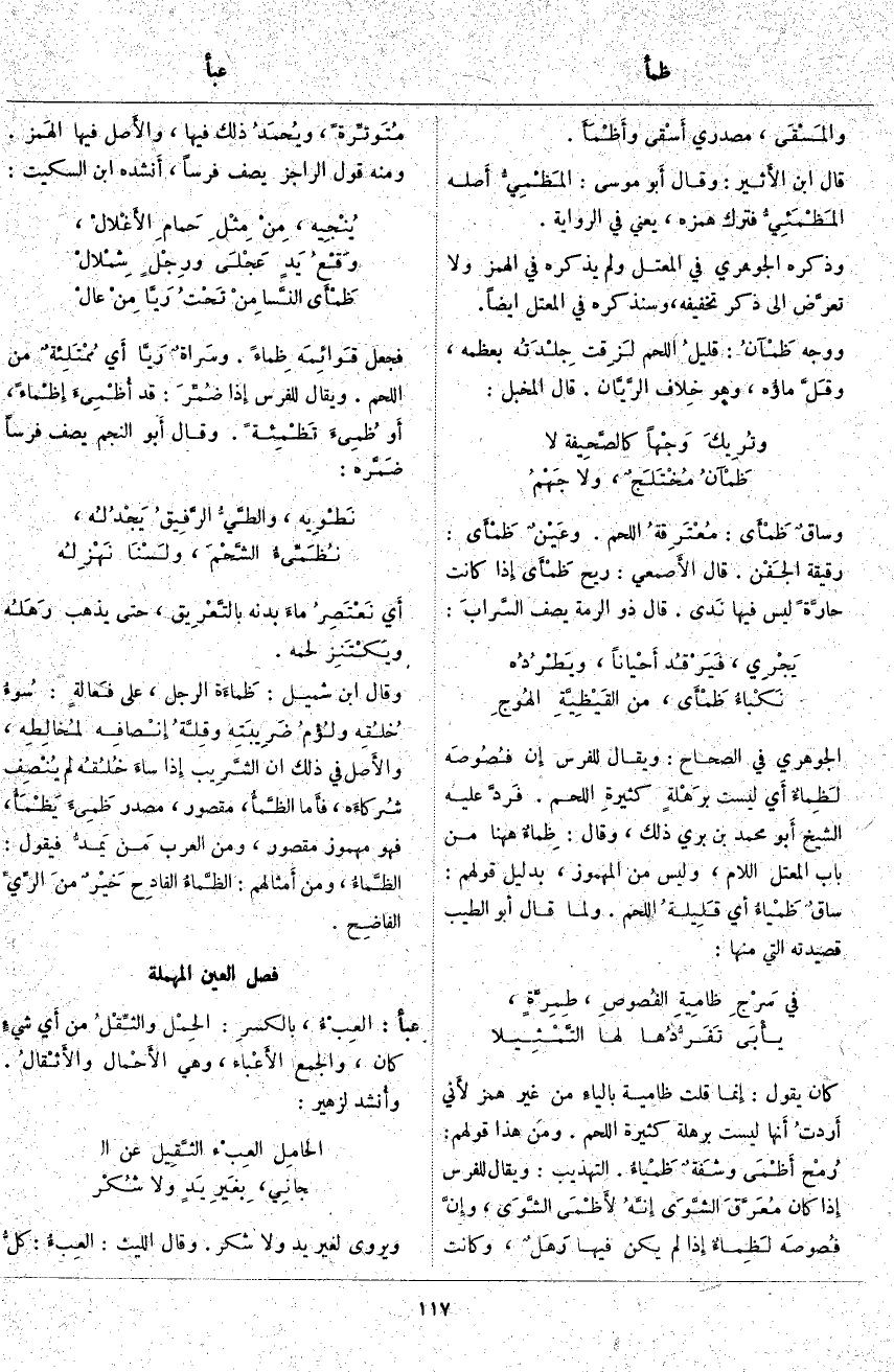 الْجَوْهَرِيُّ فِي الصِّحَاحِ: وَيُقَالُ لِلْفَرَسِ إِن فصُوصَه لَظِماءٌ أَي لَيْسَتْ برَهْلةٍ كثيرةِ اللَّحْمِ. فَردَّ عَلَيْهِ الشَّيْخُ أَبو مُحَمَّدِ بْنُ بَرِّيٍّ ذَلِكَ، وَقَالَ: ظِماءٌ ههنا مِنْ بَابِ الْمُعْتَلِّ اللَّامِ، وَلَيْسَ مِنَ الْمَهْمُوزِ، بِدَلِيلِ قَوْلِهِمْ: ساقٌ ظَمْياءُ أَي قَلِيلةُ اللَّحْمِ. وَلَمَّا قَالَ أَبو الطِّيبِ قَصِيدَتَهُ الَّتِي مِنْهَا: