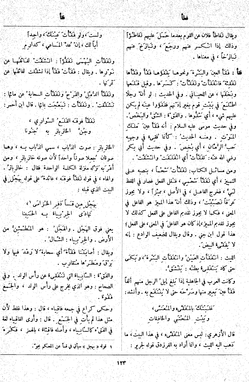أَي انْفَلَقَتْ وانْشَقَّتْ. وَمِنْ مَسَائِلِ الْكِتَابِ: تَفَقَأْتُ شَحْماً، بِنَصْبِهِ عَلَى التَّمْيِيزِ، أَي تَفَقَّأَ شَحْمِي، فنُقِل الْفِعْلُ فَصَارَ فِي اللَّفْظِ لَيٌّ، فَخَرَجَ الْفَاعِلُ، فِي الأَصل، مميِّزاً، وَلَا يَجُوزُ عَرَقاً تَصَبَّبتُ، وَذَلِكَ أَن هَذَا الْمُمَيِّزُ هُوَ الْفَاعِلُ فِي الْمَعْنَى، فَكَمَا لَا يَجُوزُ تَقْدِيمُ الْفَاعِلِ عَلَى الْفِعْلِ كَذَلِكَ لَا يَجُوزُ تَقْدِيمُ الْمُمَيِّزِ، إِذْ كَانَ هُوَ الْفَاعِلَ فِي الْمَعْنَى، عَلَى الْفِعْلِ؛ هَذَا قَوْلُ ابْنِ جِنِّي. وَقَالَ وَيُقَالُ لِلضَّعِيفِ الْوَادِعُ: إِنَّهُ لَا يُفَقِّئُ البيضَ. اللَّيْثُ: انْفَقَأَتِ العَينُ وانْفَقَأَتِ البَثْرةُ، وَبَكَى حَتَّى كَادَ يَنْفَقِئُ بطنُه: يَنْشَقُّ. وَكَانَتِ الْعَرَبُ فِي الْجَاهِلِيَّةِ إِذَا بَلغ إبلُ الرَّجُلِ مِنْهُمْ أَلفاً فَقَأَ عينَ بعِير مِنْهَا وسرَّحَه حَتَّى لَا يُنْتَفَع بِهِ. وأَنشد: