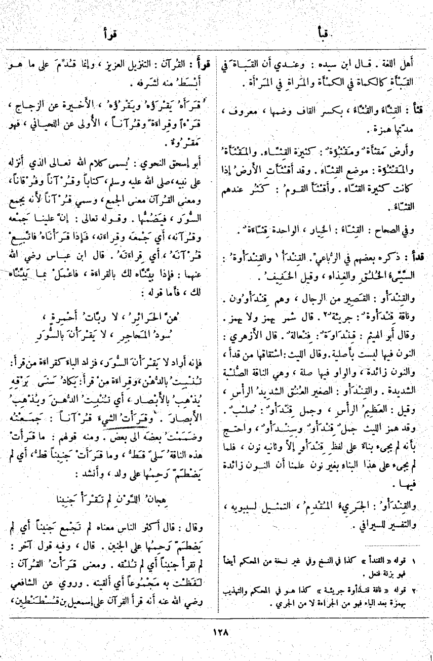 قرأ: القُرآن: التَّنْزِيلُ الْعَزِيزُ، وَإِنَّمَا قُدِّمَ عَلَى مَا هُوَ أَبْسَطُ مِنْهُ لشَرفه. قَرَأَهُ يَقْرَؤُهُ ويَقْرُؤُهُ، الأَخيرة عَنِ الزَّجَّاجِ، قَرْءاً وقِراءَةً وقُرآناً، الأُولى عَنِ اللِّحْيَانِيِّ، فَهُوَ مَقْرُوءٌ. أَبو إِسحاق النَّحْوِيُّ: يُسمى كَلَامُ اللَّهِ تَعَالَى الَّذِي أَنزله عَلَى نَبِيَّهُ، صَلَّى اللَّهُ عَلَيْهِ وَسَلَّمَ، كِتَابًا وقُرْآناً وفُرْقاناً، وَمَعْنَى القُرآن مَعْنَى الْجَمْعِ، وَسُمِّيَ قُرْآناً لأَنه يَجْمَعُ السُّوَر، فيَضُمُّها. وَقَوْلُهُ تَعَالَى: إِنَّ عَلَيْنا جَمْعَهُ وَقُرْآنَهُ