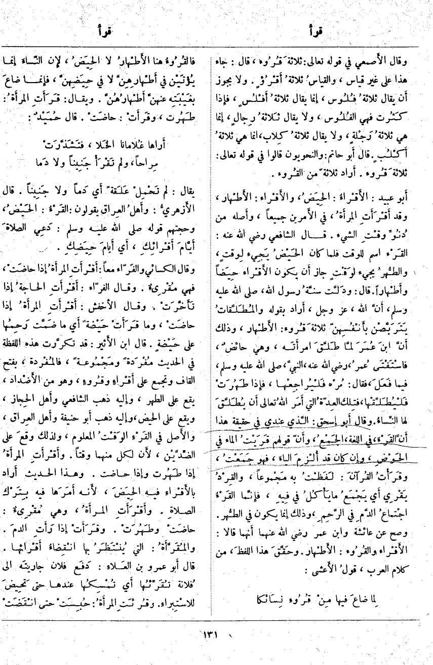 فالقُرُوءُ هُنَا الأَطْهارُ لَا الحِيَضُ، لأَن النّساءَ إِنما يُؤْتَيْن فِي أَطْهارِهِنَّ لَا فِي حِيَضِهنَّ، فإِنما ضاعَ بغَيْبَتِه عنهنَّ أَطْهارُهُنَّ، وَيُقَالُ: قَرَأَتِ المرأَةُ: طَهُرت، وقَرَأَتْ: حاضَتْ. قَالَ حُمَيْدٌ: