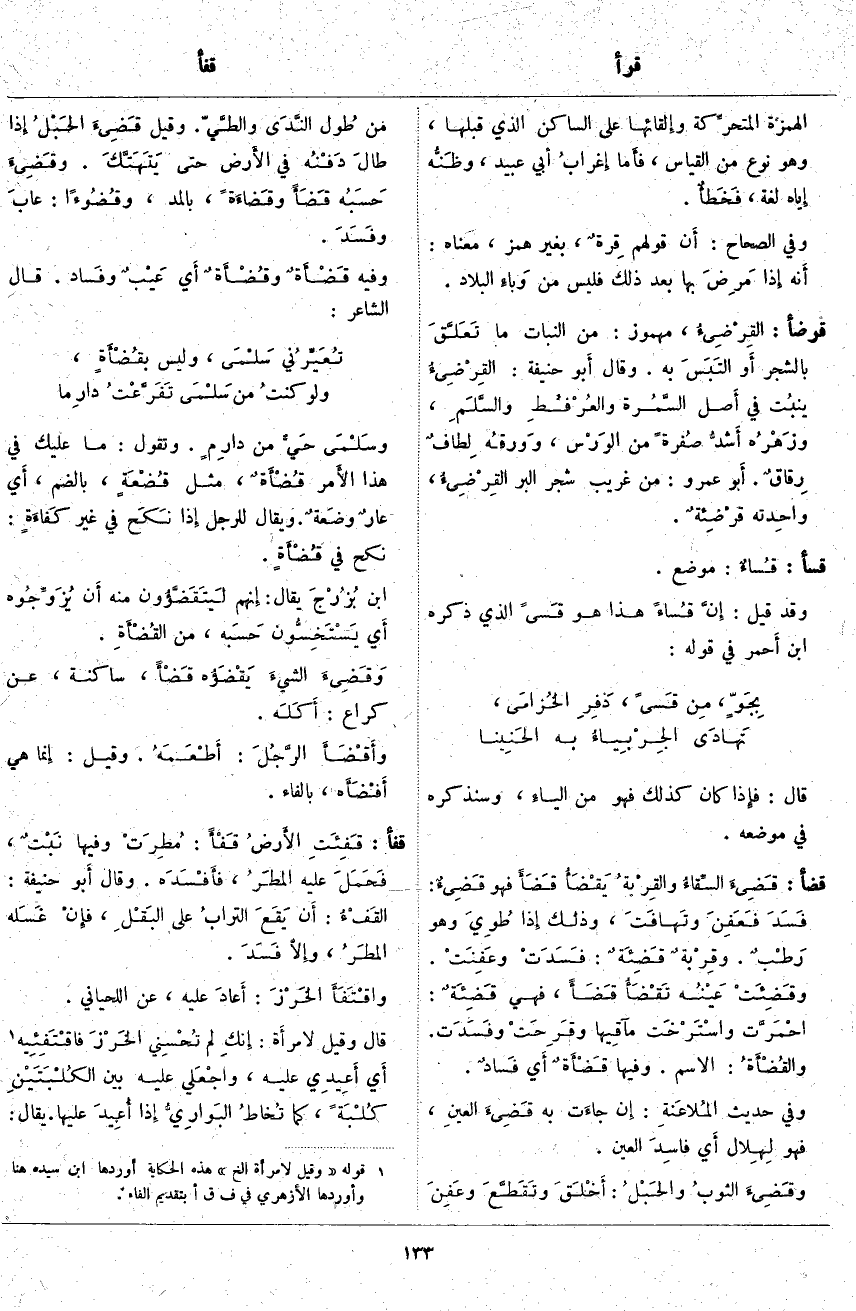 قفأ: قَفِئَتِ الأَرضُ قَفْأً: مُطِرَتْ وَفِيهَا نَبْتٌ، فَحَمَلَ عَلَيْهِ المطَرُ، فأَفْسَدَه. وَقَالَ أَبو حَنِيفَةَ: القَفْءُ: أَن يَقَعَ الترابُ عَلَى البَقْلِ، فإِنْ غَسَله المطَرُ، وإلَّا فَسَدَ. واقْتَفَأَ الخَرْزَ: أَعادَ عَلَيْهِ، عَنِ اللِّحْيَانِيِّ. قَالَ وَقِيلَ لامرأَة: إِنكِ لَمْ تُحْسِني الخَرْزَ فاقْتَفِئِيه «1» أَي أَعِيدِي عَلَيْهِ، واجْعَلي عَلَيْهِ بَيْنَ الكُلْبَتَيْنِ كُلْبَةً، كَمَا تُخاطُ البَوارِيُّ إِذَا أُعِيدَ عليها. يقال: