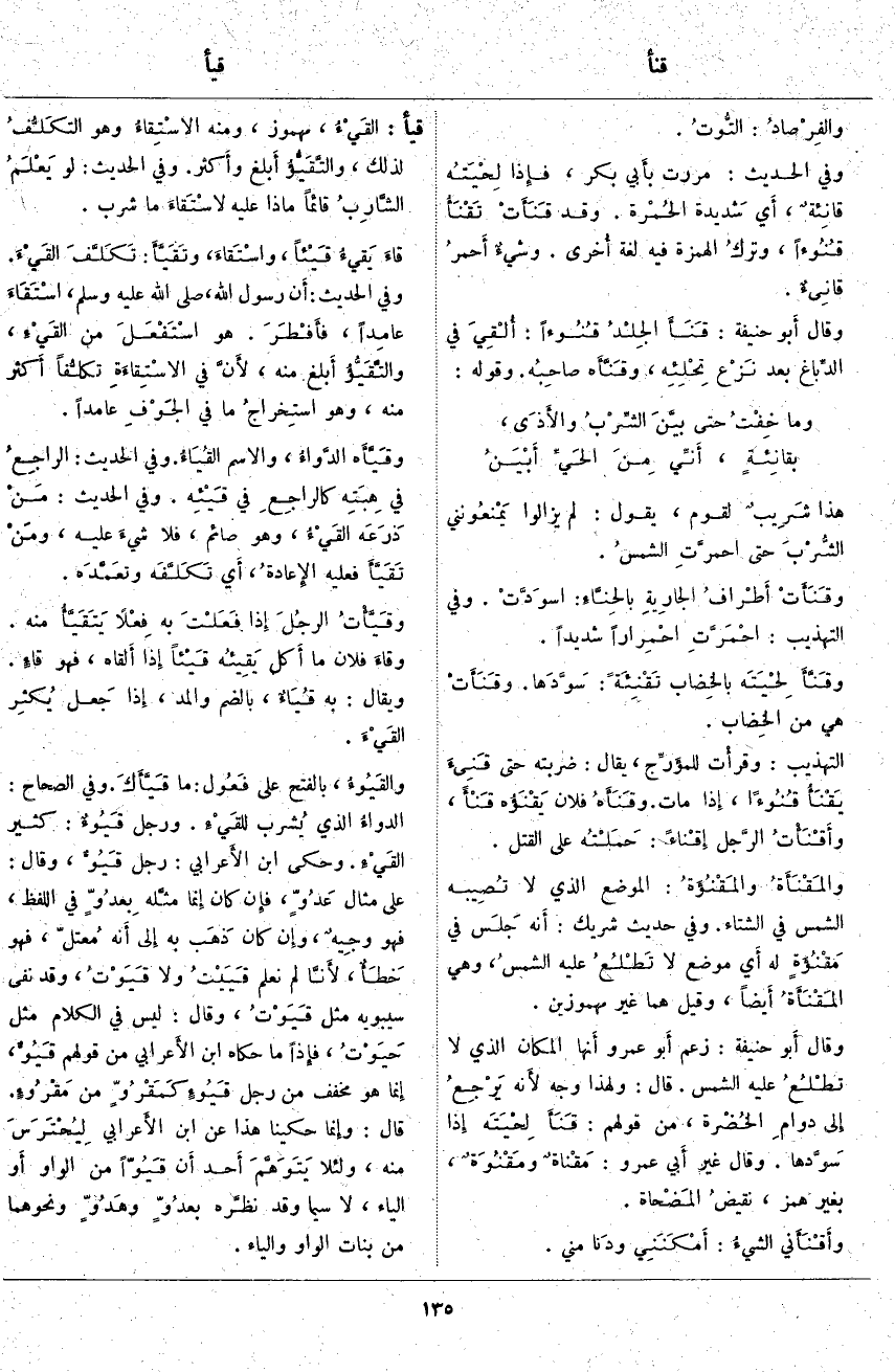 قيأ: القَيْءُ، مَهْمُوزٌ، وَمِنْهُ الاسْتِقاءُ وَهُوَ التكَلُّفُ لِذَلِكَ، والتَّقَيُّؤُ أَبلغ وأَكثر. وَفِي الْحَدِيثِ: