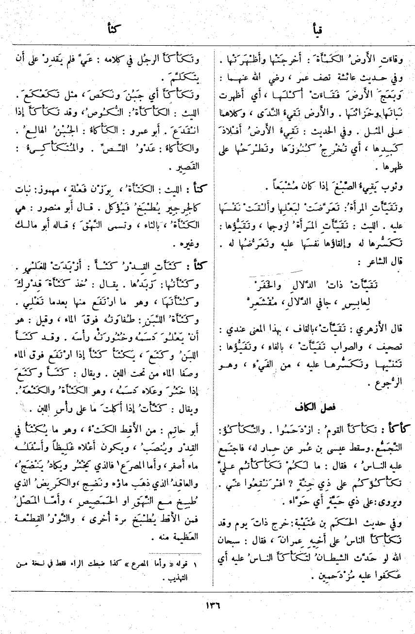 كثأ: كَثَأَتِ القِدْرُ كَثْأً: أَزْبَدَتْ للغَلْيِ. وكَثْأَتُها: زَبَدُها. يُقَالُ: خُذ كَثْأَةَ قِدْرِكَ وكُثْأَتَهَا، وَهُوَ مَا ارْتَفَع منها بعد ما تَغْلِي، وكَثْأَةُ اللَّبَنِ: طُفاوَتُه فوقَ الْمَاءِ، وَقِيلَ: هُوَ أَنْ يَعْلُوَ دَسَمُه وخُثُورَتُه رأْسَه. وَقَدْ كَثَأَ اللبَنُ وكَثَعَ، يَكْثَأُ كَثْأً إذا ارْتَفَعِ فَوْقَ الْمَاءِ وصَفا الْمَاءُ مِنْ تَحْتِ اللَّبَنِ. وَيُقَالُ: كَثَأَ وكَثَعَ إِذَا خَثُرَ وعَلاه دَسَمُه، وَهُوَ الكَثْأَةُ والكَثْعَةُ. وَيُقَالُ: كَثَّأْتُ إِذَا أَكلتَ مَا عَلَى رأْسِ اللَّبَنِ. أَبو حاتِم: مِنَ الأَقِط الكَثْءُ، وَهُوَ مَا يُكْثَأُ فِي القِدْر ويُنصَبُ، وَيَكُونُ أَعْلاه غَلِيظاً وأَسْفَلُه مَاءً أَصفر، وأَما المصرَع «2» فَالَّذِي يَخْثُر ويكادُ يَنْضَجُ، والعاقِدُ الَّذِي ذهَب مَاؤُهُ ونَضِج، والكَرِيضُ الَّذِي طُبِخ مَعَ النَّهَقِ أَوِ الحَمَصِيصِ، وأَمّا المَصْلُ فَمِنَ الأَقط يُطْبَخ مَرَّةً أُخرى، والثَّوْرُ القِطْعة العَظيمة مِنْهُ.