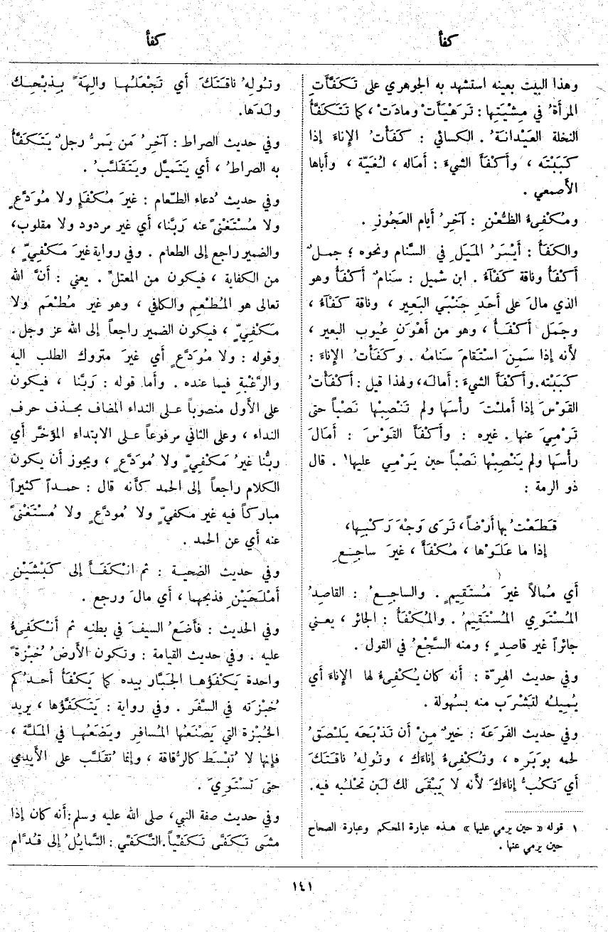 وَهَذَا الْبَيْتُ بِعَيْنِهِ اسْتَشْهَدَ بِهِ الْجَوْهَرِيُّ عَلَى تَكَفَّأَتِ المرأَةُ فِي مِشْيَتِها: تَرَهْيَأَتْ ومادَتْ، كَمَا تَتَكَفَّأُ النَّخْلَةُ العَيْدانَةُ. الْكِسَائِيُّ: كَفَأْتُ الإِناءَ إِذَا كَبَبْتَه، وأَكْفَأَ الشيءَ: أَمَاله، لُغَيّة، وأَباها الأَصمعي. ومُكْفِئُ الظُعْنِ: آخِرُ أَيام العَجُوزِ. والكَفَأُ: أَيْسَرُ المَيَلِ فِي السَّنام وَنَحْوِهِ؛ جملٌ أَكْفَأُ وَنَاقَةٌ كَفْآءُ. ابْنُ شُمَيْلٍ: سَنامٌ أَكْفَأُ وَهُوَ الَّذِي مالَ عَلَى أَحَدِ جَنْبَي البَعِير، وَنَاقَةٌ كَفْآءُ وجَمَل أَكْفَأُ، وَهُوَ مِنْ أَهْوَنِ عِيوب الْبَعِيرِ لأَنه إِذَا سَمِنَ اسْتَقامَ سَنامُه. وكَفَأْتُ الإِناءَ: كَبَبْته. وأَكْفَأَ الشيءَ: أَمالَه، وَلِهَذَا قِيلَ: أَكْفَأْتُ القَوْسَ إِذَا أَملْتَ رأَسَها وَلَمْ تَنْصِبْها نَصْباً حَتَّى تَرْمِيَ عَنْهَا. غَيْرُهُ: وأَكْفَأَ القَوْسَ: أَمَالَ رأَسَها وَلَمْ يَنْصِبْها نَصْباً حِينَ يَرْمِي عَلَيْهَا «1». قَالَ ذُو الرُّمَّةِ: