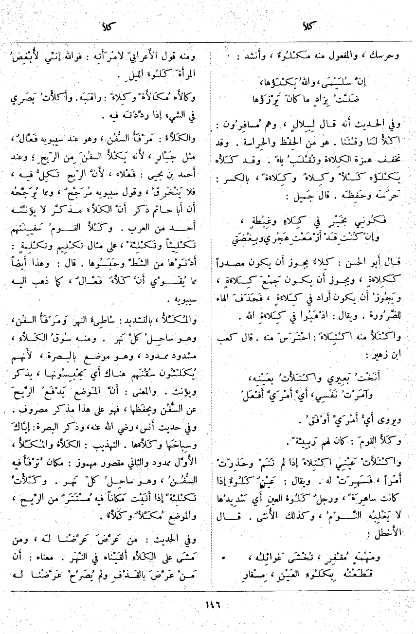 وَمِنْهُ قَوْلُ الأَعرابيّ لامْرَأَتِه: فَوَاللَّهِ إنِّي لأُبْغِضُ المرأَةَ كَلُوءَ الليلِ. وكَالَأَهُ مُكَالأَةً وكِلاءً: راقَبَه. وأَكلأْتُ بَصَرِي فِي الشَّيْءِ إِذَا ردَّدْتَه فِيهِ. والكَلّاءُ: مَرْفَأُ السُّفُن، وَهُوَ عِنْدَ سِيبَوَيْهِ فَعَّالٌ، مِثْلَ جَبَّارٍ، لأَنه يَكْلأُ السفُنَ مِن الرِّيحِ؛ وَعِنْدَ أَحمد بْنِ يَحْيَى: فَعْلاء، لأَنَّ الرِّيح تَكِلُّ فِيهِ، فَلَا يَنْخَرِقُ، وَقَوْلُ سِيبَوَيْهِ مُرَجَّحٌ، وَمِمَّا يُرَجِّحُه أَن أَبا حَاتِمٍ ذَكَرَ أَنَّ الكَلَّاءَ مذكَّر لَا يؤَنِّثه أَحد مِنَ الْعَرَبِ. وكَلَّأَ القومُ سَفيِنَتهم تَكْلِيئاً وتَكْلِئةً، عَلَى مِثَالِ تكْلِيم وتكْلِمةٍ: أَدْنَوْها مِنَ الشَطِّ وحَبَسُوها. قَالَ: وَهَذَا أَيضاً مِمَّا يُقَوِّي أَنَّ كَلَّاءً فَعَّالٌ، كَمَا ذَهَبَ إِلَيْهِ سِيبَوَيْهِ. والمُكَلَّأُ، بِالتَّشْدِيدِ: شاطِئُ النَّهْرِ وَمَرْفَأُ السفُن، وهو ساحِلُ كلِّ نَهر. وَمِنْهُ سُوقُ الكَلَّاءِ، مَشْدُودٌ مَمْدُودٌ، وَهُوَ مَوْضِعٌ بِالْبَصْرَةِ، لأَنهم يُكَلِّئُون سُفُنَهم هُنَاكَ أَي يَحْبِسُونها، يُذَكَّرُ ويؤَنث. وَالْمَعْنَى: أَنَّ المَوضع يَدْفَعُ الرِّيحَ عَنِ السُّفُن ويحفَظها، فَهُوَ عَلَى هَذَا مُذَكَّرٌ مَصْرُوفٌ. وَفِي حَدِيثِ