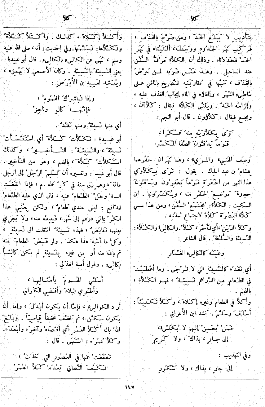 وَصَف الهَنِيءَ والمرِيءَ، وَهُمَا نَهَرانِ حَفَرهما هِشامُ بْنَ عَبْدِ الْمَلِكِ. يَقُولُ: تَرَى بِكَلَّاوَي هَذَا النَّهَرِ مِنَ الحَفَرَةِ قوْماً يَحْفِرُون ويَدُقُّونَ حِجَارَةً مَوْضِعَ الحَفْرِ مِنْهُ، ويُكَسِّرُونها. ابْنُ السِّكِّيتِ: الكَلَّاءُ: مُجْتَمَعُ السُّفُن، وَمِنْ هَذَا سُمِّيَ كَلَّاءُ البَّصْرَة كَلّاءً لِاجْتِمَاعِ سُفُنِه. وكَلأَ الدَّيْنُ، أَي تَأَخَّر، كَلأً. والكالِئُ والكُلأَة: النَّسيِئة والسُّلْفةُ. قَالَ الشَّاعِرُ: